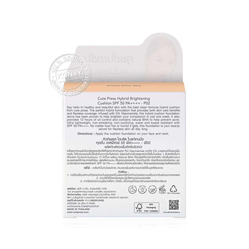 Cute Press Hybrid Brightening Cushion SPF 50 PA++++ 15g #P02 Cool Cloud ครั้งแรกกับคุชชั่นไฮบริดสูตรคลีน ที่นำ Niacinamide มากถึง 5% มาผสานเข้าในรองพื้นคุชชั่น ให้ผิวคุณสวยขึ้นได้จริงในทุกๆ วันที่แต่งหน้า ผิวแลดูกระจ่างใสขึ้นแม้ไม่ทาสกินแคร์ ควบคุมความมันนาน พร้อม Natural BHA ที่ช่วยลดโอกาสการเกิดสิว เนื้อสัมผัสบางเบาสบายผิวแต่ให้การปกปิดดีเยี่ยม สูตรติดทนนาน สีไม่ดรอปตลอดวัน กันน้ำ กันเหงื่อ ยิ่งเหงื่อออกผิวยิ่งสวย และปกป้องผิวจากแสงแดดด้วยค่า SPF 50 PA++++ เพื่อตอบโจทย์คนเมืองร้อน ให้คุณเผยผิวสวยสุขภาพดีอย่างมั่นใจ