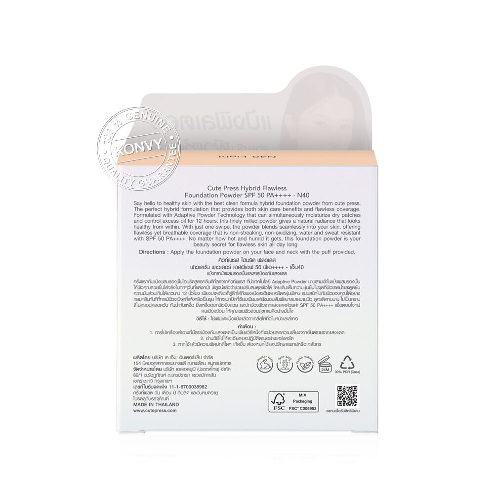 Cute Press Hybrid Flawless Foundation Powder SPF 50 PA++++ 11g #N40 Light ครั้งแรกกับแป้งผสมรองพื้นไฮบริดสูตรคลีน ที่นำเทคโนโลยี Adaptive Powder มาผสานเข้าในแป้งผสมรองพื้น ให้ผิวคุณสวยขึ้นได้จริงในทุกๆ วันที่แต่งหน้า ช่วยปรับสมดุลผิวได้ โดยเติมเต็มความชุ่มชื้นในจุดที่ผิวขาดน้ำและดูดซับความมันส่วนเกินได้ยาวนาน เพียงปาดเดียวก็รู้สึกได้ถึงผงแป้งละเอียดและยืดหยุ่นพิเศษ แนบสนิทไปกับผิวของคุณได้อย่างกลมกลืน แม้ผิวจะมีจุดที่แห้งหรือเป็นขุย ให้การปกปิดที่เรียบเนียนแต่ยังมอบสัมผัสบางเบาสบายผิว สูตรติดทนนาน ไม่เป็นคราบ สีไม่ดรอปตลอดวัน กันน้ำ กันเหงื่อ ยิ่งเหงื่อออกผิวยิ่งสวย และปกป้องผิวจากแสงแดดด้วยค่า SPF 50 PA++++ เพื่อตอบโจทย์คนเมืองร้อน ให้คุณเผยผิวสวยสุขภาพดีอย่างมั่นใจ