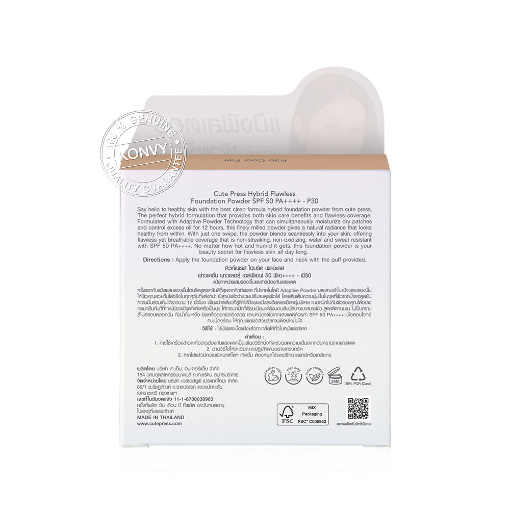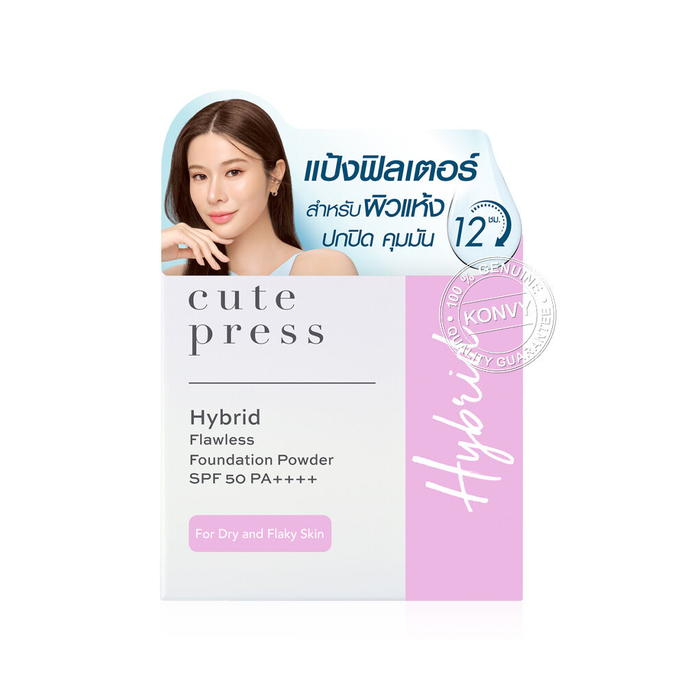 Cute Press Hybrid Flawless Foundation Powder SPF 50 PA++++ 11g #P30 Cool Fair ครั้งแรกกับแป้งผสมรองพื้นไฮบริดสูตรคลีน ที่นำเทคโนโลยี Adaptive Powder มาผสานเข้าในแป้งผสมรองพื้น ให้ผิวคุณสวยขึ้นได้จริงในทุกๆ วันที่แต่งหน้า ช่วยปรับสมดุลผิวได้ โดยเติมเต็มความชุ่มชื้นในจุดที่ผิวขาดน้ำและดูดซับความมันส่วนเกินได้ยาวนาน เพียงปาดเดียวก็รู้สึกได้ถึงผงแป้งละเอียดและยืดหยุ่นพิเศษ แนบสนิทไปกับผิวของคุณได้อย่างกลมกลืน แม้ผิวจะมีจุดที่แห้งหรือเป็นขุย ให้การปกปิดที่เรียบเนียนแต่ยังมอบสัมผัสบางเบาสบายผิว สูตรติดทนนาน ไม่เป็นคราบ สีไม่ดรอปตลอดวัน กันน้ำ กันเหงื่อ ยิ่งเหงื่อออกผิวยิ่งสวย และปกป้องผิวจากแสงแดดด้วยค่า SPF 50 PA++++ เพื่อตอบโจทย์คนเมืองร้อน ให้คุณเผยผิวสวยสุขภาพดีอย่างมั่นใจ