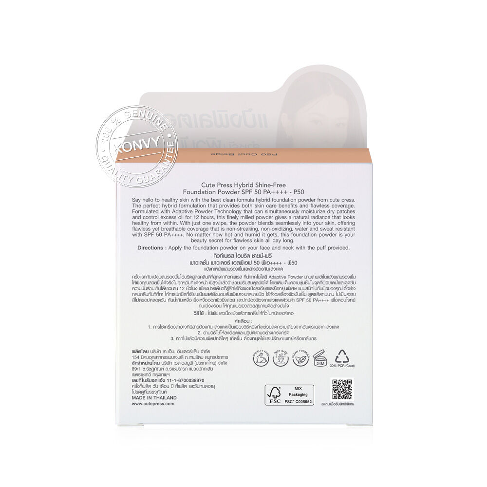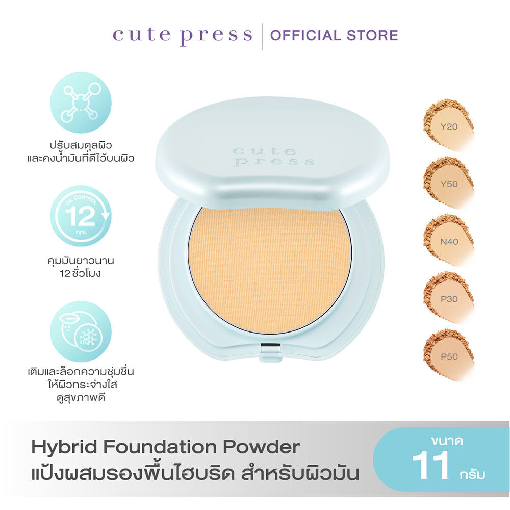 Cute Press Hybrid Shine-Free Foundation Powder SPF 50 PA++++ 11g #P50 Cool Beige ครั้งแรกกับแป้งผสมรองพื้นไฮบริดสูตรคลีน ที่นำเทคโนโลยี Adaptive Powder มาผสานเข้าในแป้งผสมรองพื้น ให้ผิวคุณสวยขึ้นได้จริงในทุกๆ วันที่แต่งหน้า ช่วยปรับสมดุลผิวได้ โดยเติมเต็มความชุ่มชื้นในจุดที่ผิวขาดน้ำและดูดซับความมันส่วนเกินได้ยาวนาน เพียงปาดเดียวก็รู้สึกได้ถึงผงแป้งละเอียดและยืดหยุ่นพิเศษ แนบสนิทไปกับผิวของคุณได้อย่างกลมกลืน ให้การปกปิดที่เรียบเนียนแต่ยังมอบสัมผัสบางเบาสบายผิว ไร้กังวลเรื่องผิวมันเยิ้ม สูตรติดทนนาน ไม่เป็นคราบ สีไม่ดรอปตลอดวัน กันน้ำ กันเหงื่อ ยิ่งเหงื่อออกผิวยิ่งสวย และปกป้องผิวจากแสงแดดด้วยค่า SPF 50 PA++++ เพื่อตอบโจทย์คนเมืองร้อน ให้คุณเผยผิวสวยสุขภาพดีอย่างมั่นใจ