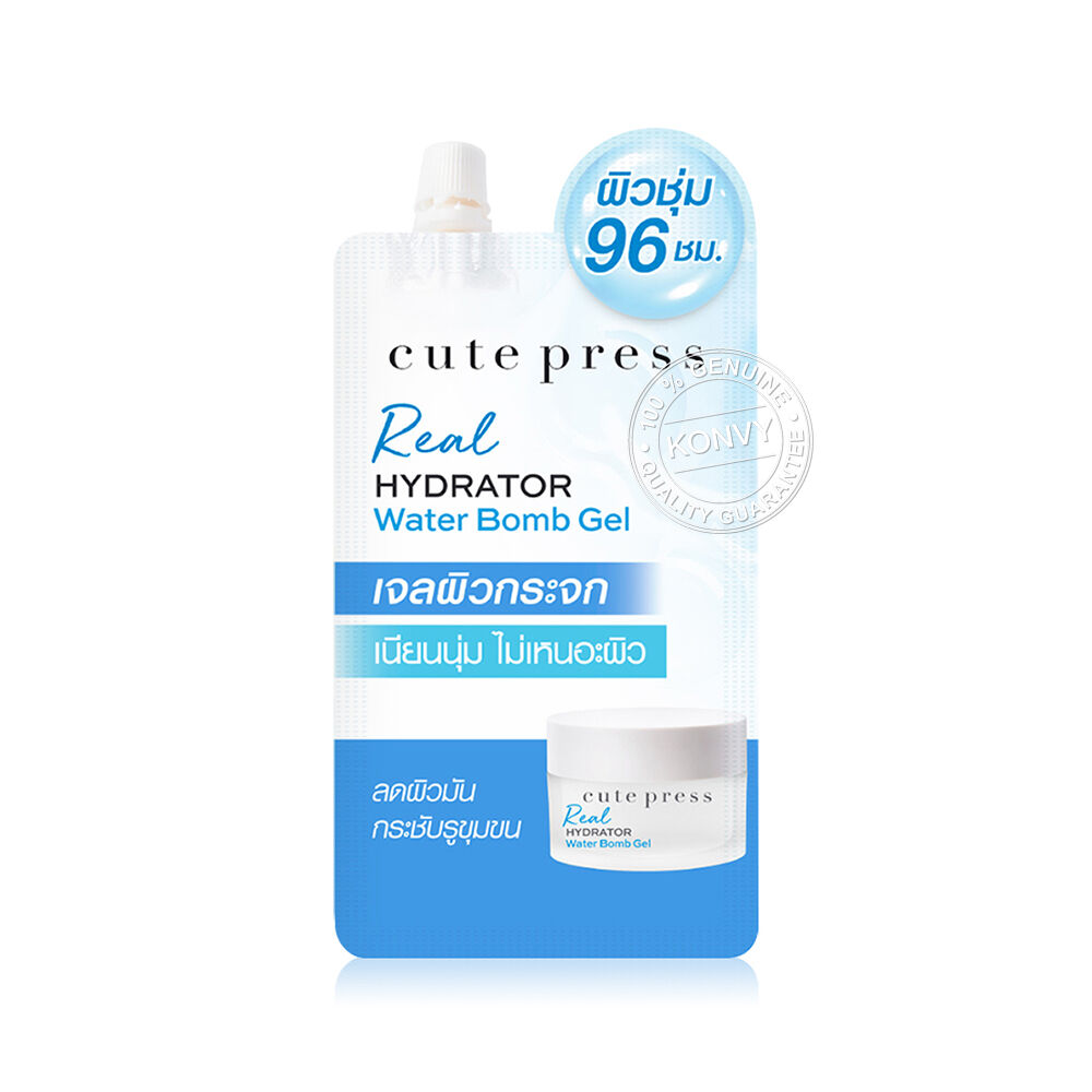 Cute Press Real Hydrator Water Bomb Gel 7g เจลบำรุงผิวหน้า สูตรปราศจากมิเนอรัล ออยล์ ซึมเร็วไม่เหนอะหนะ แตกตัวเป็นน้ำเมื่อสัมผัสผิวด้วย Water Bomb Technology ล็อกผิวฟูอิ่มน้ำตลอดวัน ด้วย 14% Glycerin และ Organic Rice Polyglutamic Acid ที่มอบความชุ่มชื้น Hyaluronic Acid พร้อม Zinc และ Encapsulated BHA ที่ช่วยกระชับรูขุมขนและลดความมันส่วนเกินซึ่งเป็นสาเหตุของสิวอุดตัน เหมาะกับทุกสภาพผิว แม้ผิวบอบบางและเป็นสิวง่าย