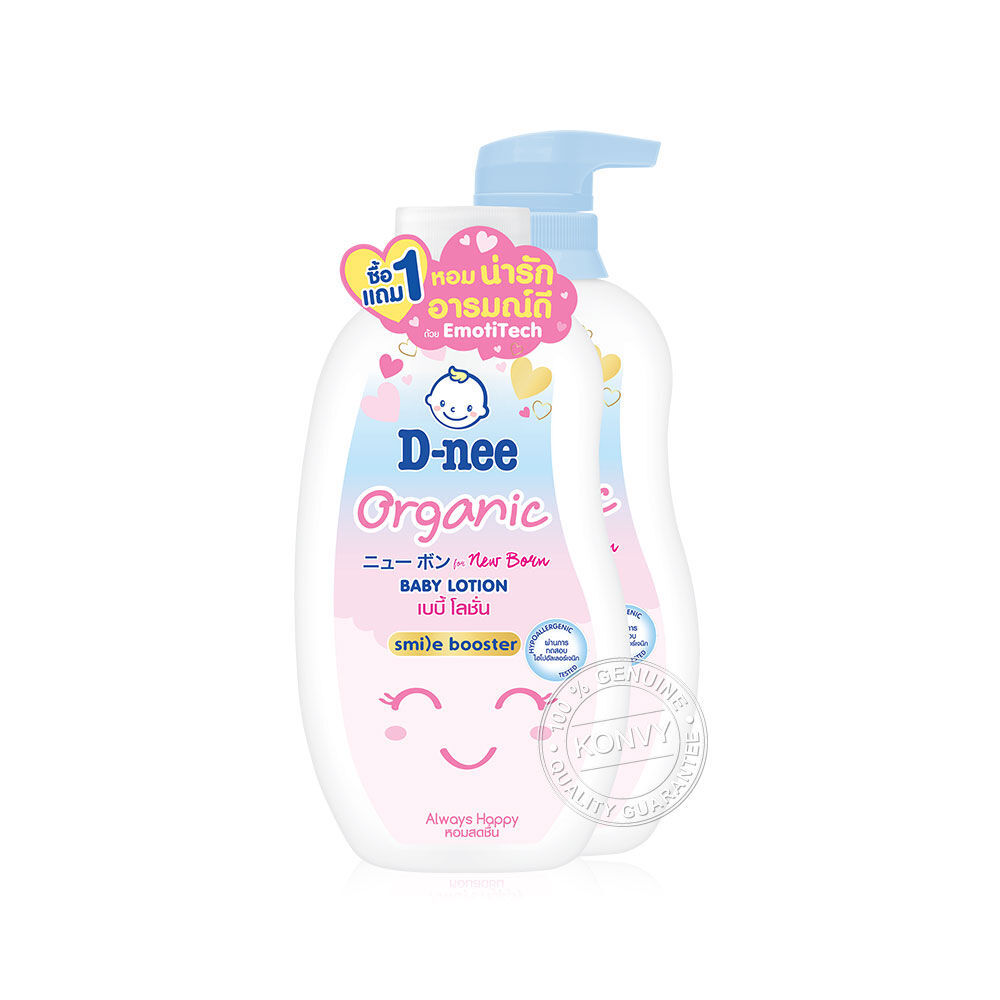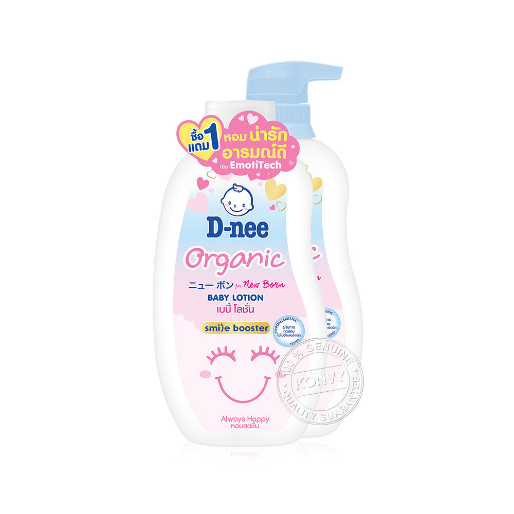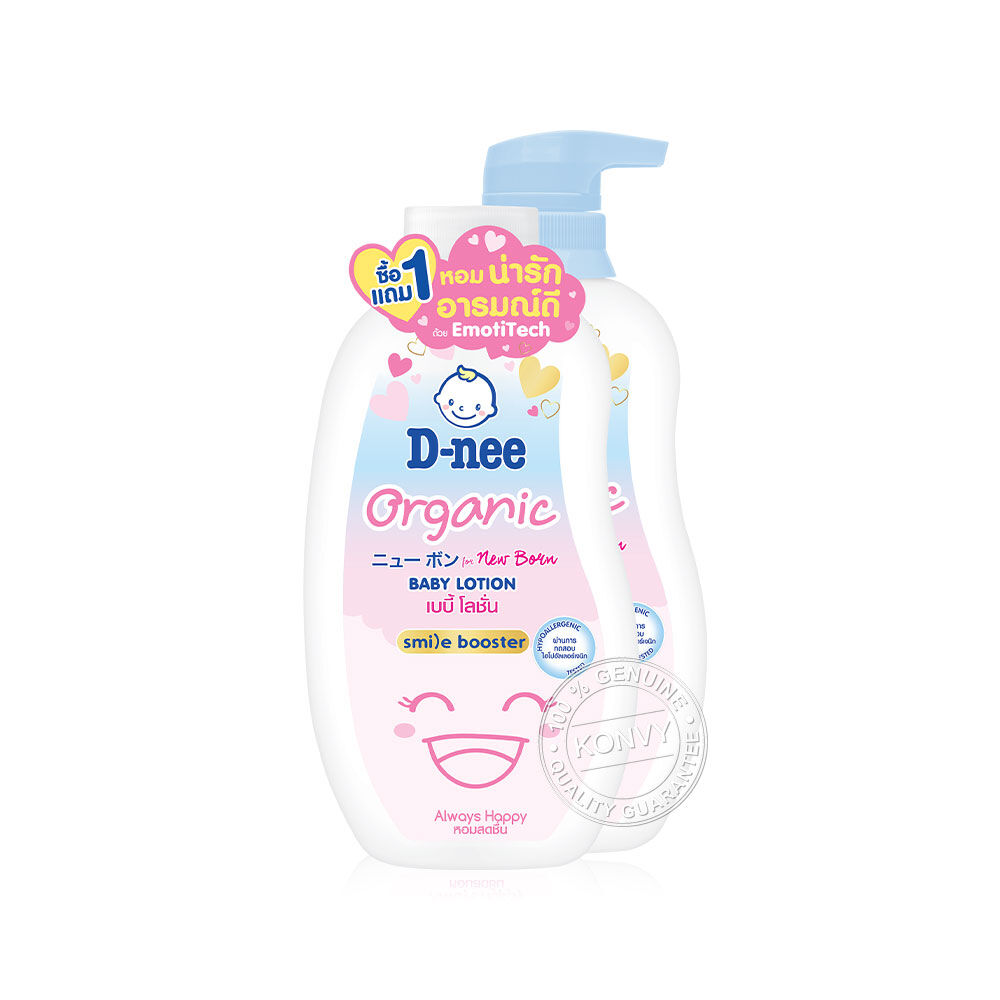 D-nee Organic Baby Lotion For Newborn Always Happy 300ml [Free! Lotion Sensitive Skin 300ml ] โลชั่นบำรุงผิว สูตรอ่อนโยนเป็นพิเศษ ช่วยบำรุงผิวให้เนียนนุ่ม ชุ่มชื้น ด้วยน้ำแร่ธรรมชาติ, ข้าวบาร์เลย์ พร้อม pH Balance ช่วยคงสมดุลตามธรรมชาติของผิว และอัลลันโทอิน ที่ช่วยลดอาการระคายเคือง