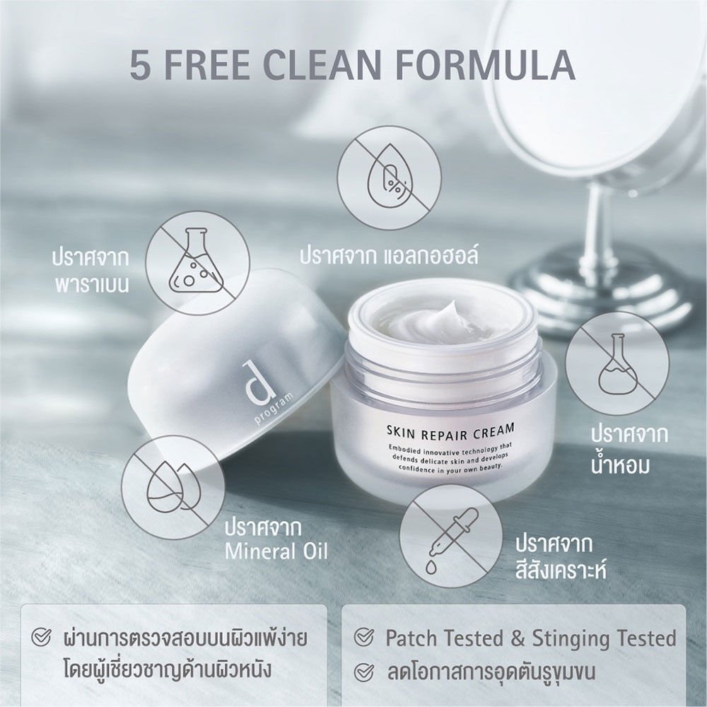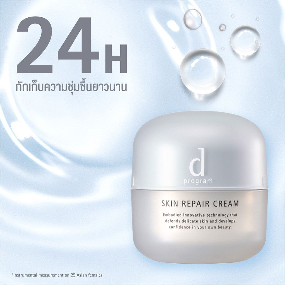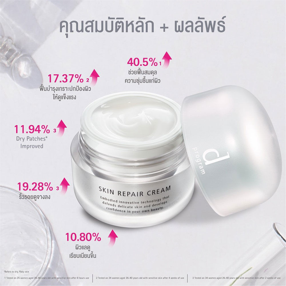D Program Skin Repair Cream 45g ครีมบำรุงผิวหน้าสำหรับบอบบางแพ้ง่าย ด้วยส่วนผสมจาก Active Ingredients และ BM Enhancer (Yeast Extract Complex + BM Support Complex) ช่วยฟื้นบำรุงและปลอบประโลมผิวบอบบางแพ้ง่าย โดยการเพิ่ม Beauty Microbiome พร้อมมี DP Complex และ Aqua Inpool ช่วยฟื้นบำรุงเกราะปกป้องผิวให้แข็งแรง และคงความชุ่มชื้นให้ผิว เผยผิวเรียบเนียน กระจ่างใส ดูสุขภาพดี