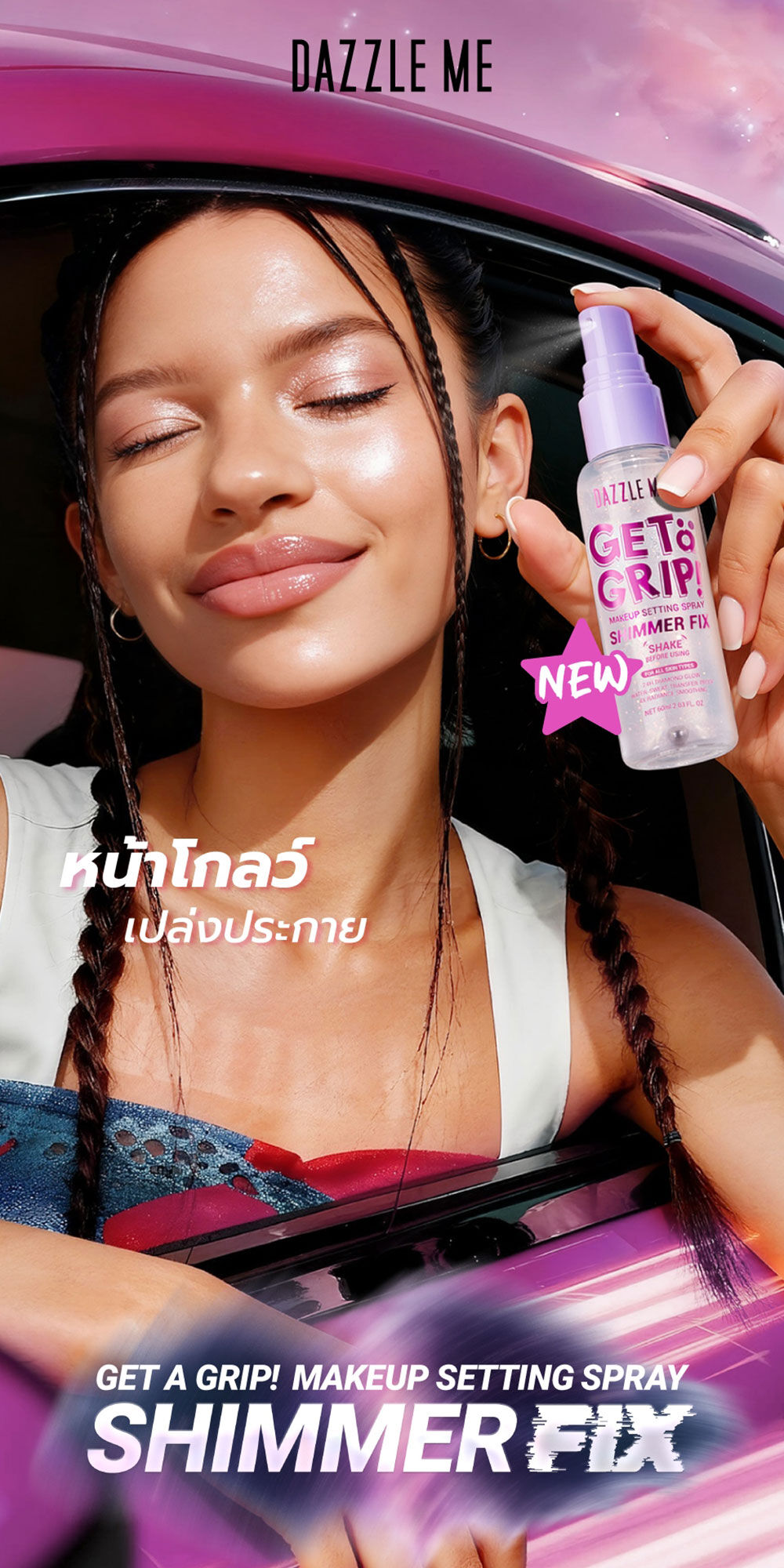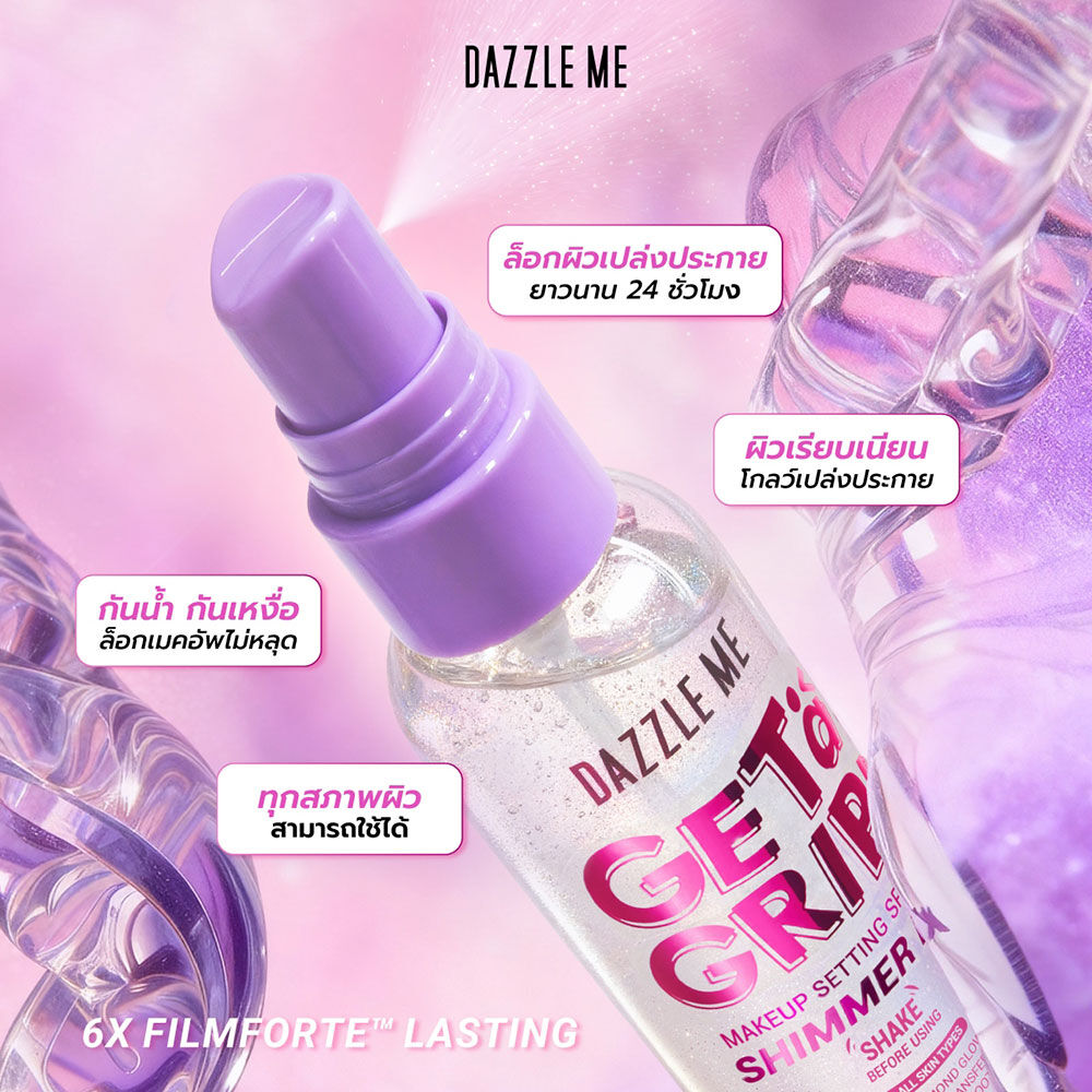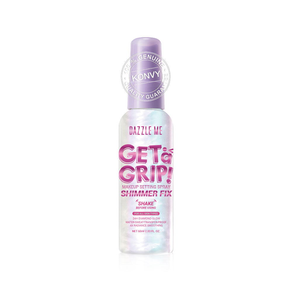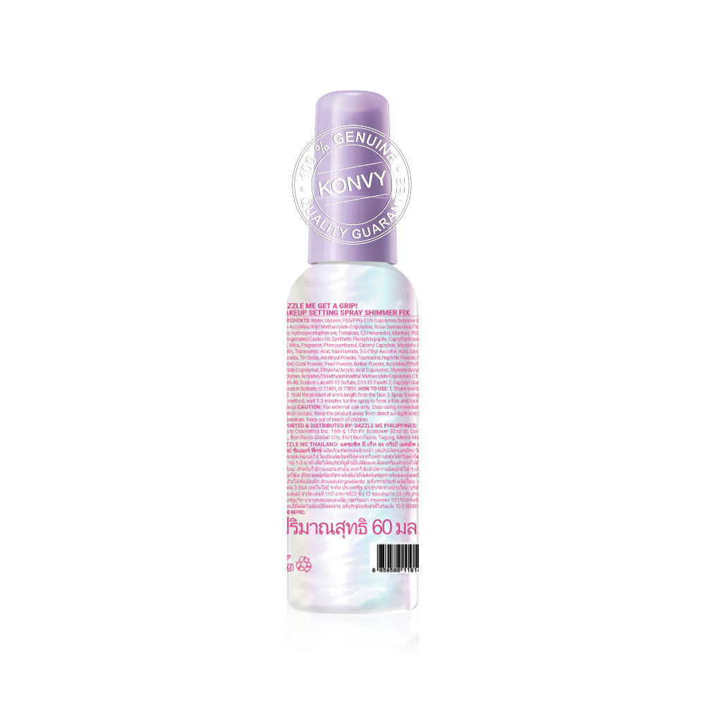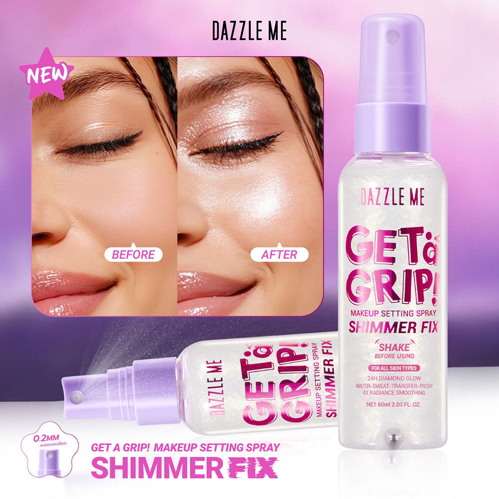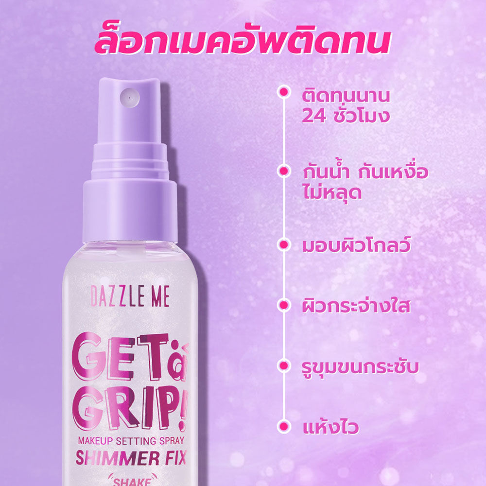 Dazzle Me Get a Grip! Makeup Setting Spray Shimmer Fix 60ml ล็อกเมคอัพให้เปล่งประกาย ด้วยเซ็ตติ้งสเปรย์สูตรชิมเมอร์ ช่วยให้เมคอัพติดทนนาน พร้อมมอบผิวฉ่ำวาว ดูโกลว์มีชีวิตชีวา บางเบา ติดทน และละอองละเอียด เพียงแค่ฉีด ผิวก็เปล่งประกาย