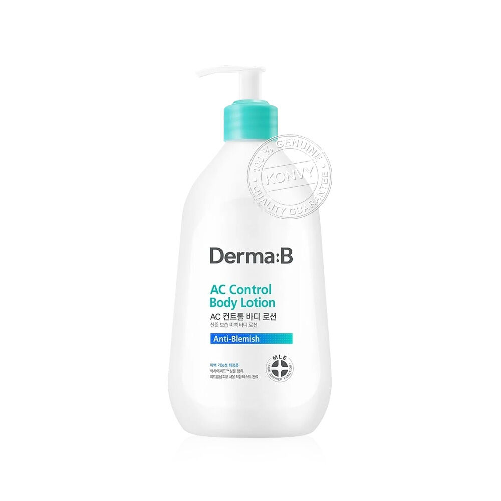 DERMA B AC Control Body Lotion 400ml โลชั่นบำรุงผิวกายสูตรสำหรับผิวแพ้ง่ายเป็นสิวและผิวไม่เรียบ ด้วยส่วนผสมเข้มข้นจาก AHA, BHA, PHA, LHA, Mentha Arvensis Acid ช่วยผลัดเซลล์ผิวและลดความมันส่วนเกิน ผสานไฮยาลูรอน 8 ชนิด, Panthenol, Shea Butter, Grape Seed Oil เติมความชุ่มชื้นยาวนาน พร้อม Niacinamide และ Melazero มอบผิวกระจ่างใส เรียบเนียนขึ้น