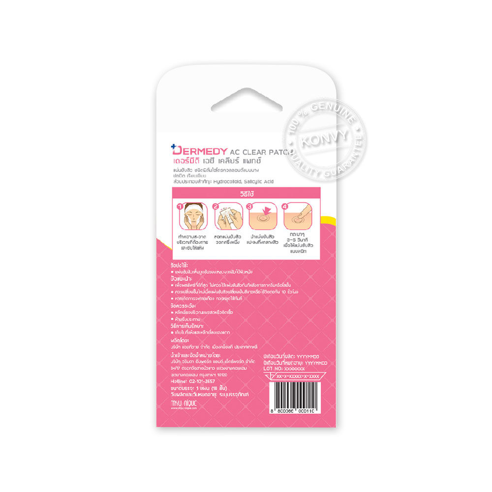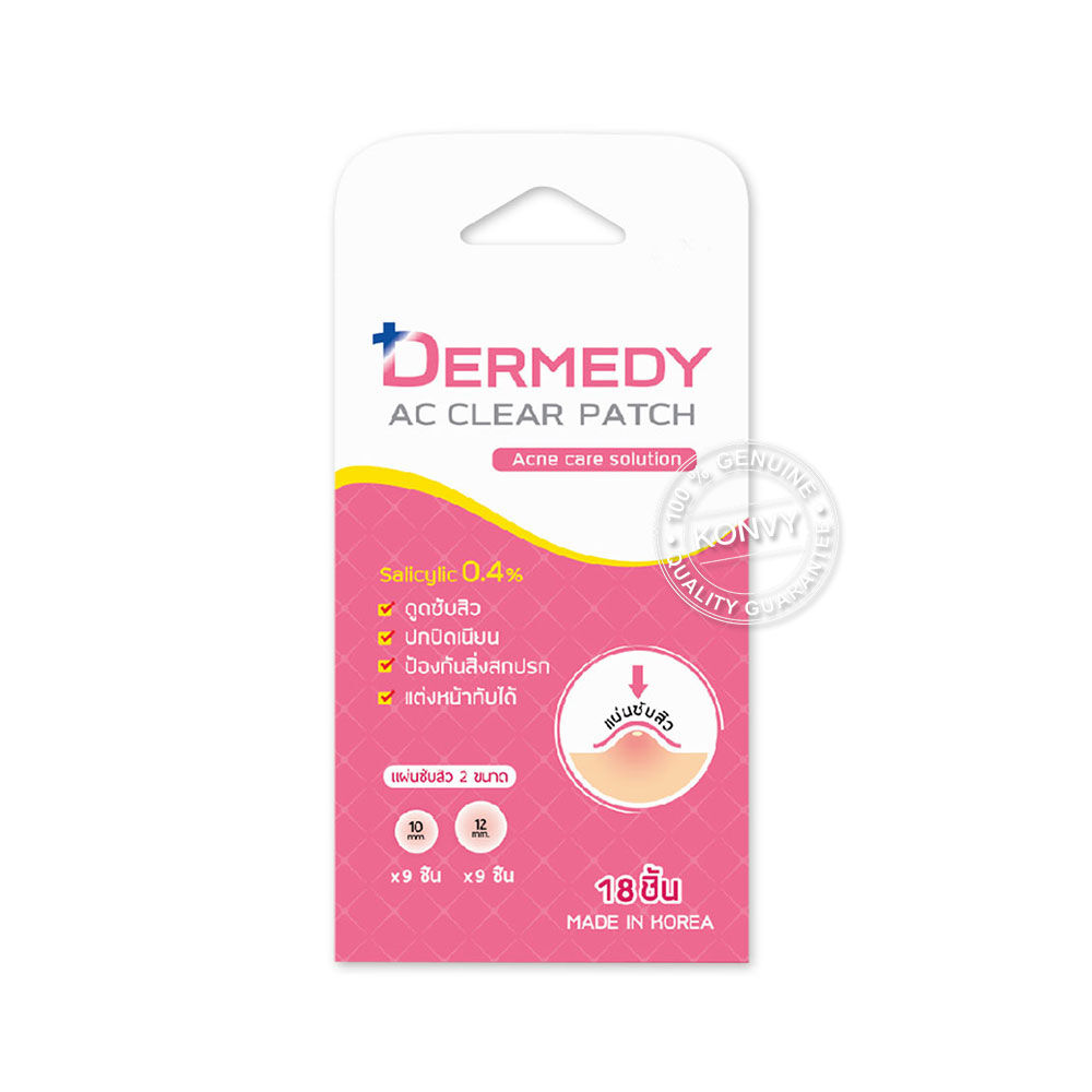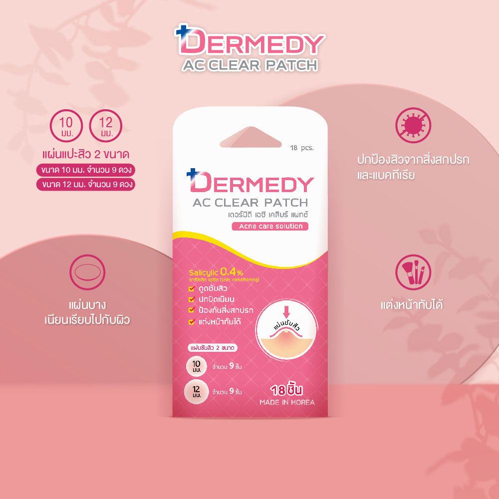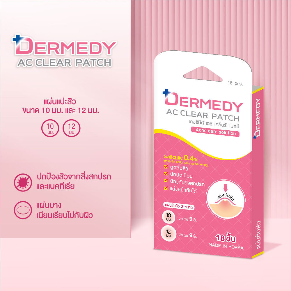 DERMEDY Ac Clear Patch 18 Dots แผ่นซับสิว แผ่นฟิล์มไฮโดรคอลลอยด์บางเพียง 0.13 มม. ปกปิดแนบสนิท ช่วยป้องกันแบคทีเรียและสิ่งสกปรก อุดมด้วยส่วนผสมหลักของ Salicylic Acid ที่มีคุณสมบัติดูแลปัญหาสิว