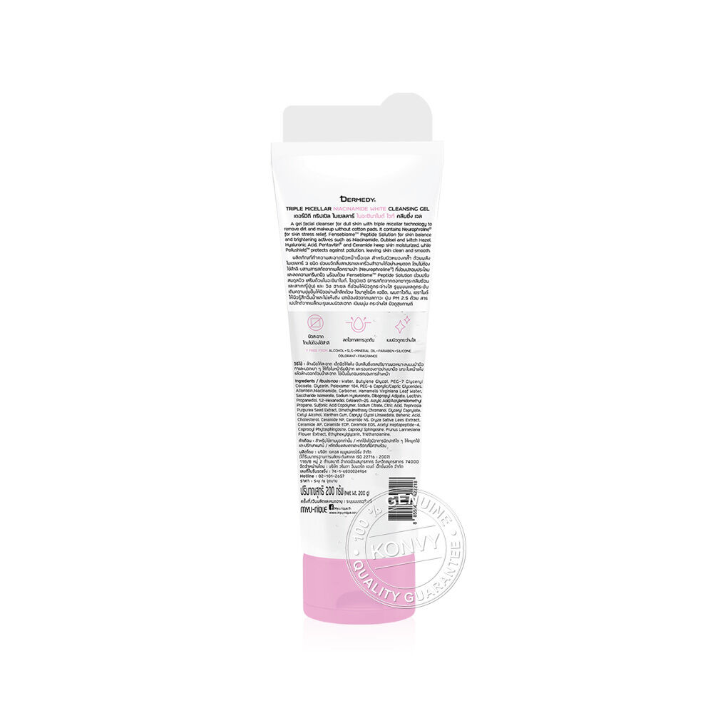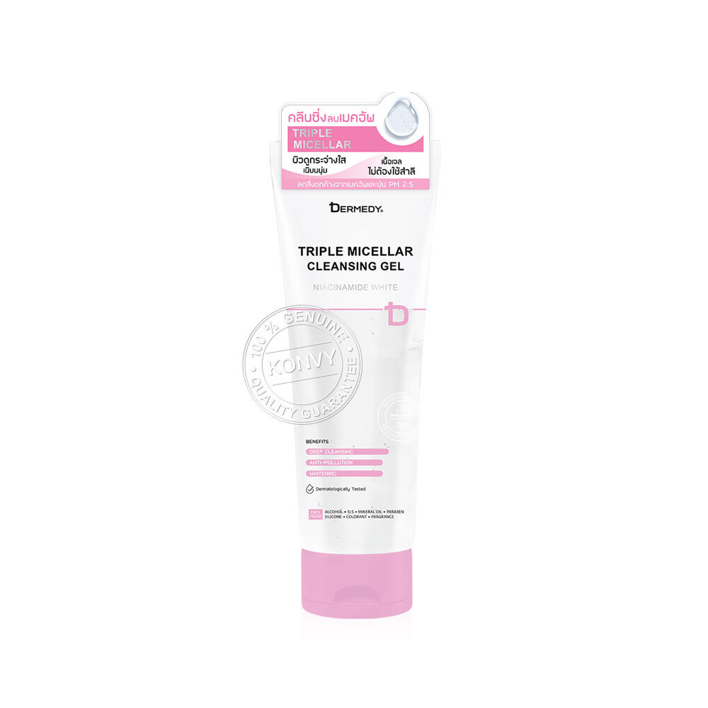 DERMEDY Triple Micellar Niacinamide White Cleansing Gel 200g คลีนซิ่งเจล สูตรสำหรับผิวหมองคล้ำ ด้วยพลังไมเซลลาร์ 3 ชนิด ช่วยขจัดสิ่งสกปรกและคราบเมคอัพได้อย่างหมดจด โดยไม่ต้องใช้สำลี ผสานสารสกัดจากเมล็ดครามป่า (Neurophroline®) และ Fensebiome™ Peptide Solution ช่วยปลอบประโลม และปรับสมดุลผิว พร้อมมี Niacinamide, สารสกัดจากดอกซากุระหมัก (OUBISEI) และ Witch Hazel ช่วยปรับผิวให้แลดูกระจ่างใส รูขุมขนกระชับ เสริมด้วย Hyaluronic Acid, Pentavitin®, Ceramide และสารเปปไทด์จากเมล็ดมะรุม ช่วยเติมความชุ่มชื้นให้ผิวอย่างล้ำลึก และปกป้องผิวจากมลภาวะ ฝุ่น PM 2.5 เผยผิวสะอาด เนียนนุ่ม กระจ่างใส