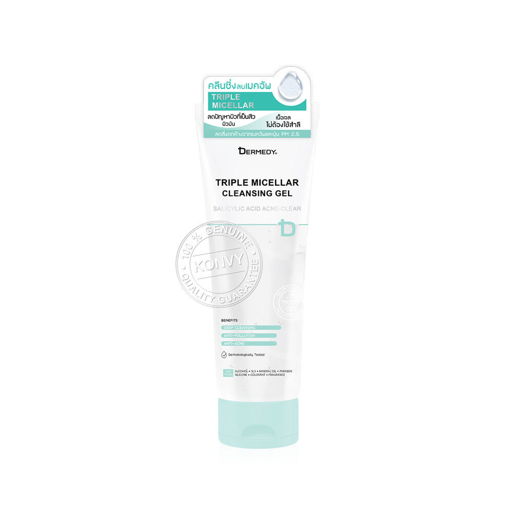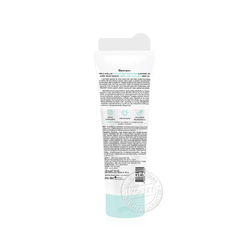 DERMEDY Triple Micellar Salicylic Acid Acne-Clear Cleansing Gel 200g คลีนซิ่งเจล สูตรสำหรับผิวที่มีแนวโน้มเป็นสิวง่าย ด้วยพลังไมเซลลาร์ 3 ชนิด ช่วยขจัดสิ่งสกปรกและคราบเมคอัพได้อย่างหมดจด โดยไม่ต้องใช้สำลี ผสานสารสกัดจากเมล็ดครามป่า (Neurophroline®) และ Fensebiome™ Peptide Solution ช่วยปลอบประโลม และปรับสมดุลผิว พร้อมมี Salicylic Acid, Tree Tea Oil และ Witch Hazel ช่วยผลัดเซลล์ผิว ลดความมันส่วนเกิน และลดโอกาสเกิดสิว เสริมด้วย Hyaluronic Acid, Pentavitin®, Ceramide และสารเปปไทด์จากเมล็ดมะรุม ช่วยเติมความชุ่มชื้นให้ผิวอย่างล้ำลึก และปกป้องผิวจากมลภาวะ ฝุ่น PM 2.5 เผยผิวสะอาด เนียนนุ่ม สุขภาพดี