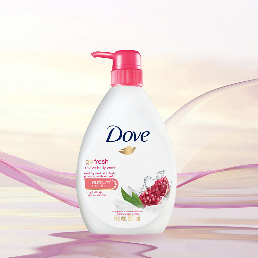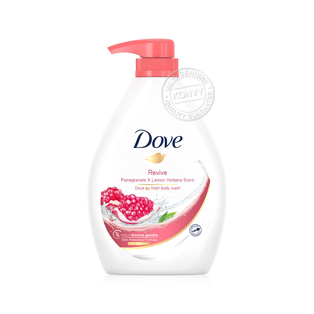 Dove Go Fresh Revive Body Wash 1000ml ครีมอาบน้ำสูตรล้างออกง่าย ผสานพรีไบโอติกอย่างลงตัว คงความสมดุลความชุ่มชื้นให้ผิวดูสุขภาพดี อิ่มน้ำ มีชีวิตชีวาอีกครั้ง พร้อมบำรุงผิวอย่างล้ำลึก ปลุกความสดชื่นอย่างอ่อนโยน ผสานสารสกัดของทับทิม และกลิ่นหอมเลมอนเวอร์บีน่า ให้ผิวดื่มด่ำความสดชื่น เนียนนุ่ม เปล่งปลั่งอย่างเต็มที่หลังอาบน้ำ