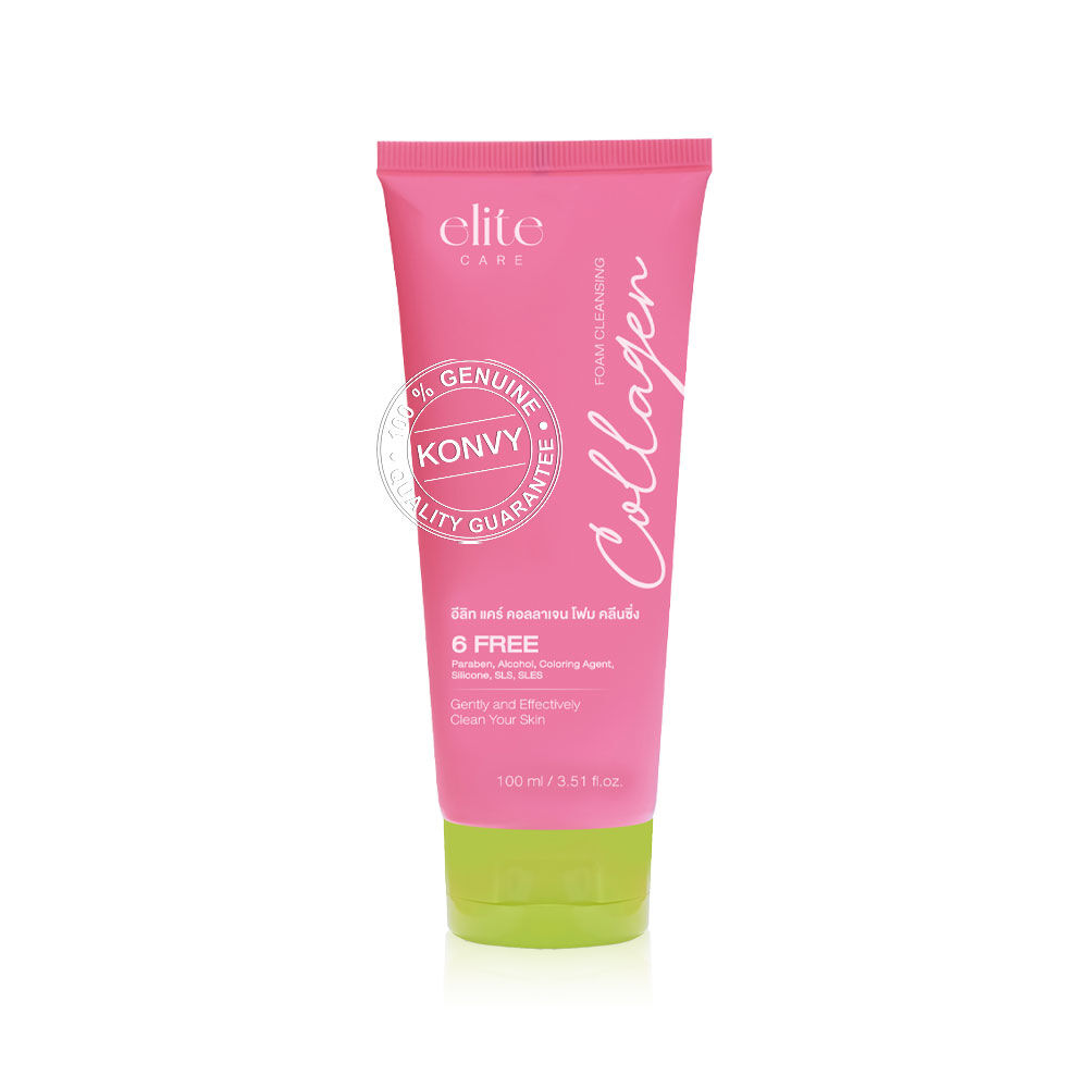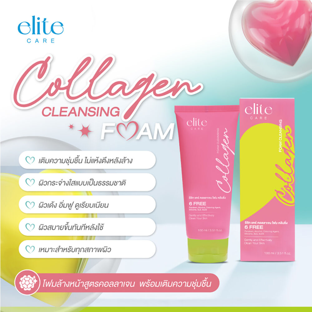 Elite Care Collagen Foam Cleansing 100ml โฟมล้างหน้าสูตรคอลลาเจน ช่วยทำความสะอาดผิวได้อย่างหมดจด โดยไม่ทำให้ผิวแห้งตึง พร้อมผสานสารสกัดจากใบชาเขียว, CICA, Rosa Water และ Collagen ช่วยปลอบประโลม และเติมความชุ่มชื้น เสริมความยืดหยุ่นให้ผิว มอบผิวสะอาดใส นุ่มเด้ง สุขภาพดี