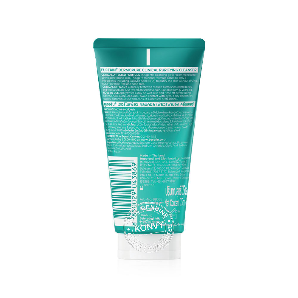 Eucerin Dermopure Clinical Purifying Cleanser 75ml เจลล้างหน้าสูตรอ่อนโยน สำหรับผิวมันเป็นสิว ที่ผสานส่วนผสมสำคัญ 8 ชนิด รวม ถึง Salicylic Acid (BHA) ทำความสะอาดผิวอย่างล้ำลึก โดยไม่ทำให้ผิวแห้งตึง