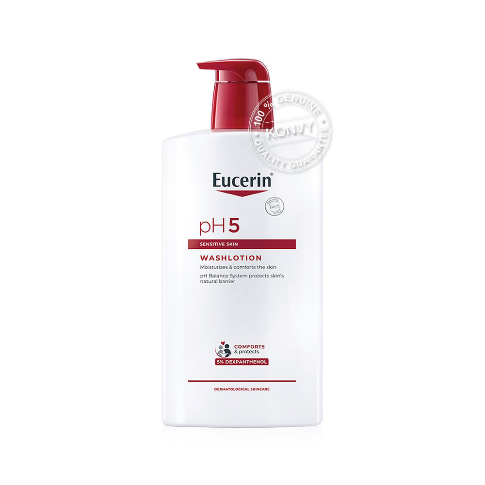 Eucerin PH5 Sensitive Skin Washlotion 1000ml โลชั่นอาบน้ำถนอมผิว สำหรับผู้ที่มีผิวแห้งมาก และแพ้ง่าย โดยมีส่วนผสมที่ปราศจากความเป็นด่างของสบู่ จึงช่วยคงสมดุลในการปกป้องชั้นผิว pH5 Enzyme Protection เสริมเกราะปกป้องผิวจากธรรมชาติผสานซิเตรตบัฟเฟอร์ เข้าฟื้นบำรุงและเสริมการทำงานของเอนไซม์ในผิว ให้ผิวกลับรู้สึกแข็งแรงขึ้น เสริมเกราะปกป้องผิว เพิ่มความชุ่มชื้นป้องกันผิวแห้งเสีย