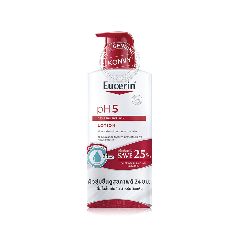 Save 25% Eucerin pH5 Dry Sensitive Skin Lotion [400ml x 2pcs] ผลิตภัณฑ์บำรุงผิวกาย สำหรับผิวแห้ง บอบบางแพ้ง่าย เพื่อเสริมเกราะปกป้องผิว ผิวจึงไม่ไวต่อปัจจัยกระตุ้น ด้วย pH5 Balance System & 5% Dexpanthenol นวัตกรรมที่ไม่เพียงเพิ่มและกักเก็บความชุ่มชื้นในผิว แต่ยังช่วยปรับและคงสมดุลสภาพแวดล้อมในเซลล์ผิวไว้ที่ค่าตามธรรม่ชาติของผิวสุขภาพดี เพื่อเสริมให้การผลัดเซลล์ผิว เป็นไปอย่างสมบูรณ์ เสริมเกราะปกป้องผิว ผิวจึงไม่ไวต่อปัจจัยกระตุ้นต่างๆ