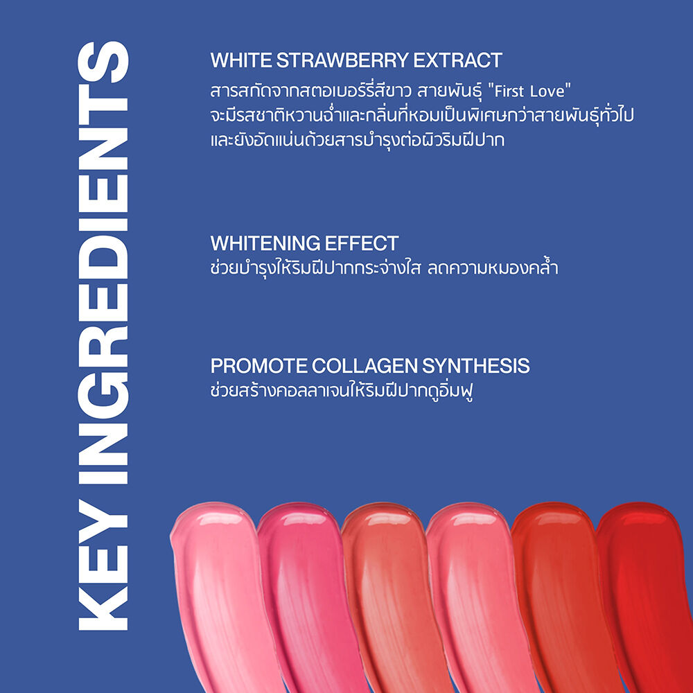 • มีสารสกัดจาก White Strawberry, Hyaluronic Acid, Vitamin E ช่วยบำรุงริมฝีปากให้เนียนนุ่ม ชุ่มชื้น ดูสุขภาพดี