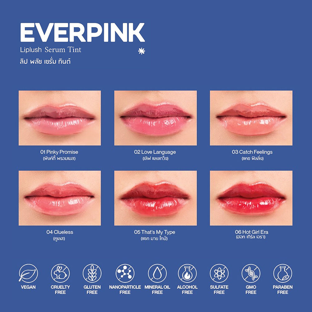 EVERPINK Liplush Serum Tint 2.5g #01 Pinky Promise เซรั่มทินท์บำรุงเข้มข้น เปลี่ยนริมฝีปากให้ดูอวบอิ่ม ฉ่ำวาว มีชีวิตชีวา ด้วยเนื้อสัมผัสนุ่มฟูแบบ "Plush Texture" (เนื้อพลัช) เกลี่ยง่าย ไม่เป็นคราบ ไม่ตกร่อง เติมได้ตลอดวัน สีสวยละมุน พร้อมมอบการบำรุงแบบ Intensive ในหนึ่งเดียว