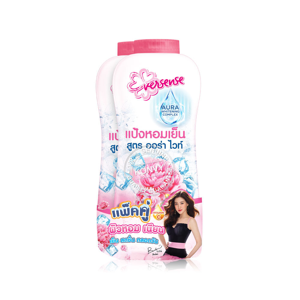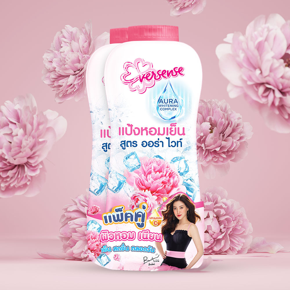 Eversense Aura White Cooling Powder Pink [280g x 2pcs] แป้งหอมเย็นสูตรออร่าไวท์ กลิ่น Pink ให้ผิวเนียน เย็นสบาย หอม สดชื่น ตลอดวัน