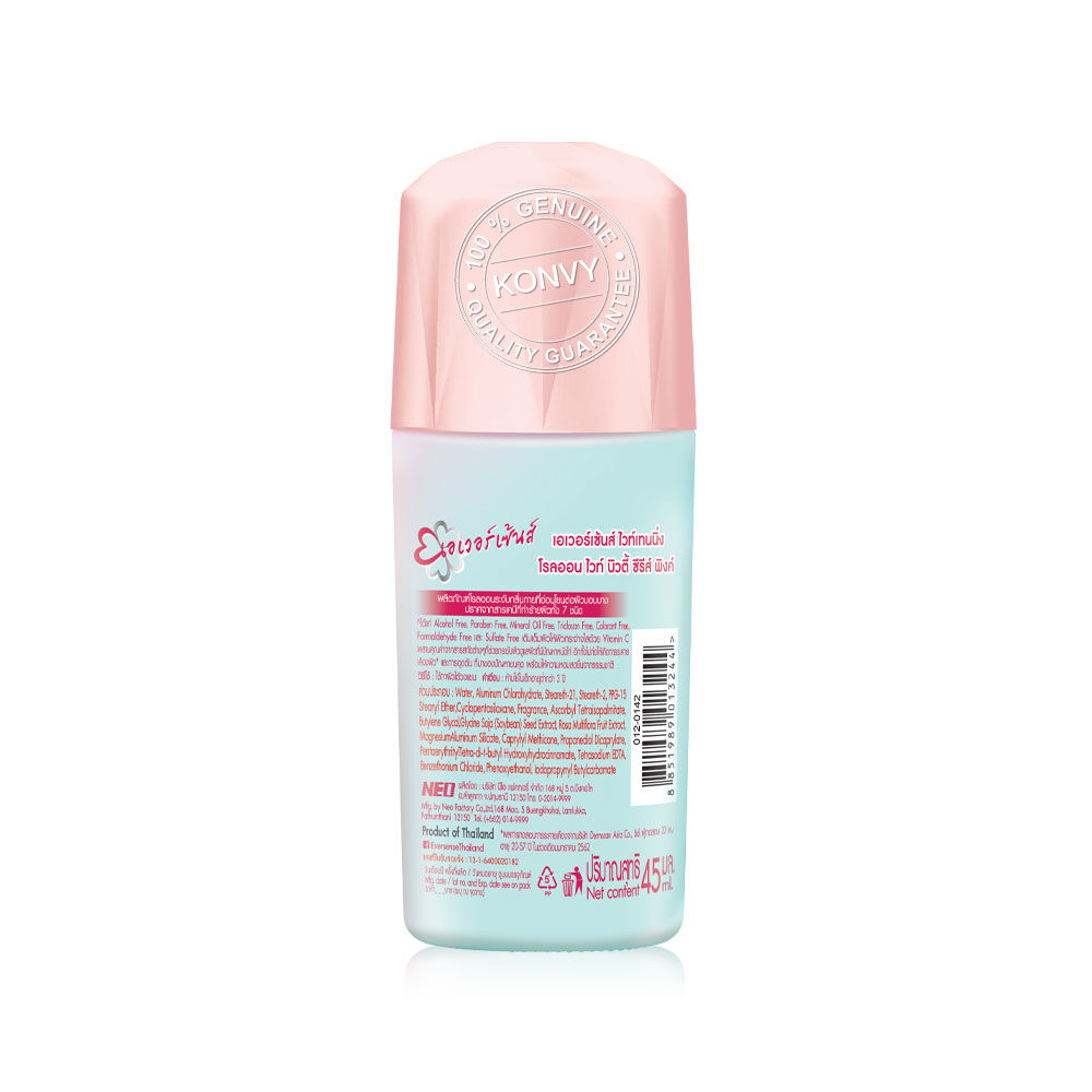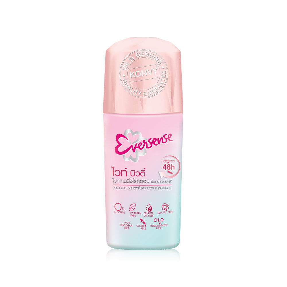 Eversense Whitening Roll On White Beauty [45ml x 3pcs] โรลออนระงับกลิ่นกายที่อ่อนโยนต่อผิวบอบบาง เติมเต็มให้ผิวกระจ่างใสด้วย Vitamin C ผสานคุณค่าจากสารสกัดต่างๆ ที่ช่วยกระชับผิว ดูแลผิวที่มีปัญหาหนังไก่ อีกทั้งไม่ก้อให้เกิดการระคายเคืองผิว และการอุดตัน ที่มาของปัญหาขนคุด พร้อมให้ความหอมสดชื่นจากธรรมชาติ ปราศจากสารเคมีที่ทำร้ายผิวทั้ง 7 ชนิด
