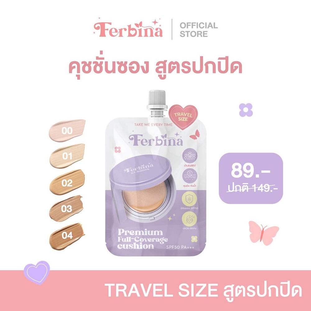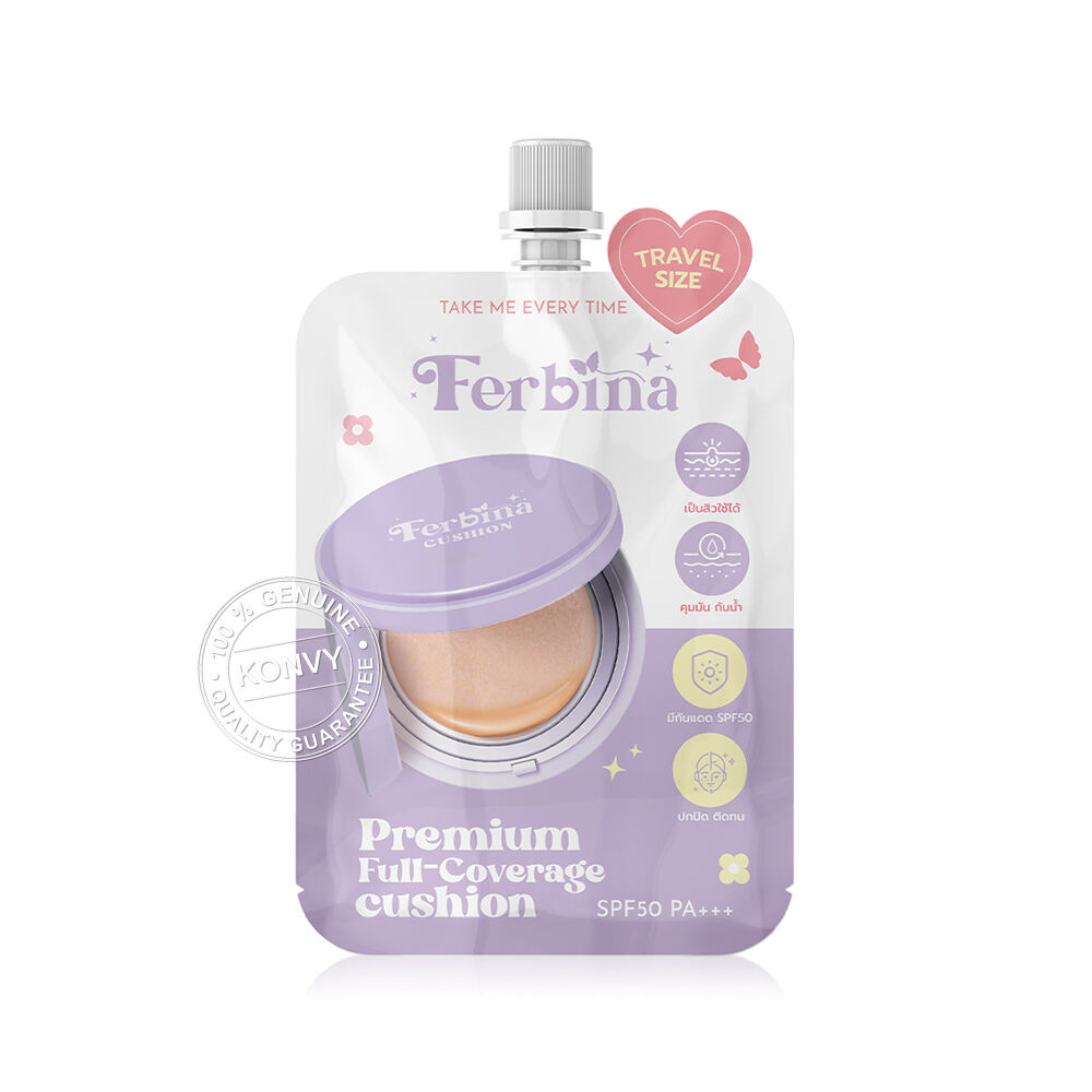 FERBINA Premium Full-Coverage Cushion SPF50 PA+++ Travel Size 5g #04 Honey คุชชั่นแบบซอง เนื้อรองพื้นที่มีโมเลกุลขนาดเล็ก สูตรสำหรับเพิ่มความปกปิดในระดับ Medium-Full Coverage ปกปิดรอยสิวและความหมองคล้ำ เบลอผิวให้สวยกริ๊บไม่หนักผิว คุมมัน ติดทนยาวนาน กันน้ำ กันเหงื่อ มีสารบำรุงในตัว สำหรับคนเป็นสิว ผิวแพ้ง่ายสามารถใช้ได้ และมีกันแดด SPF50 PA+++ เนื้อบางเบา ไม่อุดตันผิว เหมาะกับทุกสภาพผิว