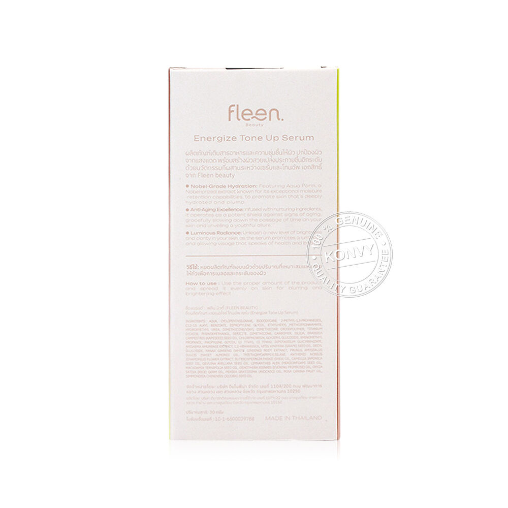 Fleen Beauty Energize Tone Up Serum 30g เบสโทนอัพเซรั่ม ที่มีนวัตกรรม Pearly Vital Encapsulation ช่วยกักเก็บความเฟรชของโทนอัพเซรั่มในรูปแบบแคปซูล ผสานสารสกัดจากดินแดนตะวันออกทั้ง 5 ชนิด อันได้แก่ Dark Spot Fight, Licorice Extract, White Ginseng, Chamomile และ Shea Butter ช่วยฟื้นบำรุงผิวล้ำลึก เติมความชุ่มชื้น พร้อมปรับผิวให้แลดูกระจ่างใส ปกป้องผิวจากแสงแดด และมีนวัตกรรม Fixible Film ช่วยเสริมประสิทธิภาพการแต่งหน้าให้ติดทนมากยิ่งขึ้น สร้างผิวสวยอิ่มฟู ดูอ่อนเยาว์