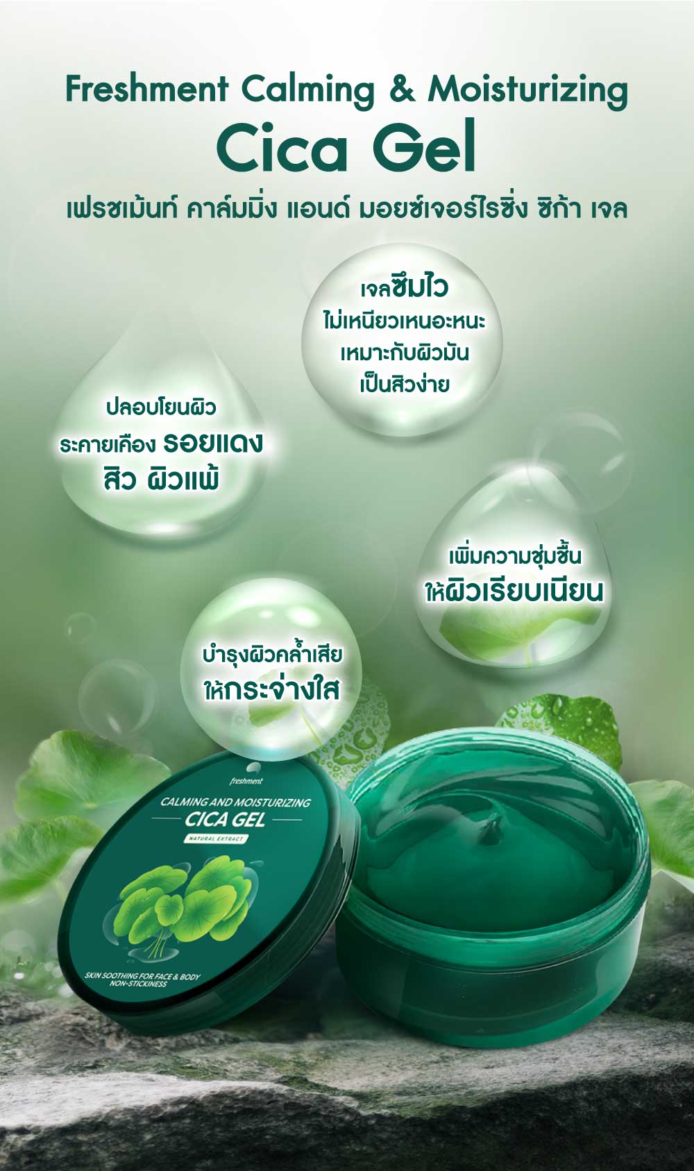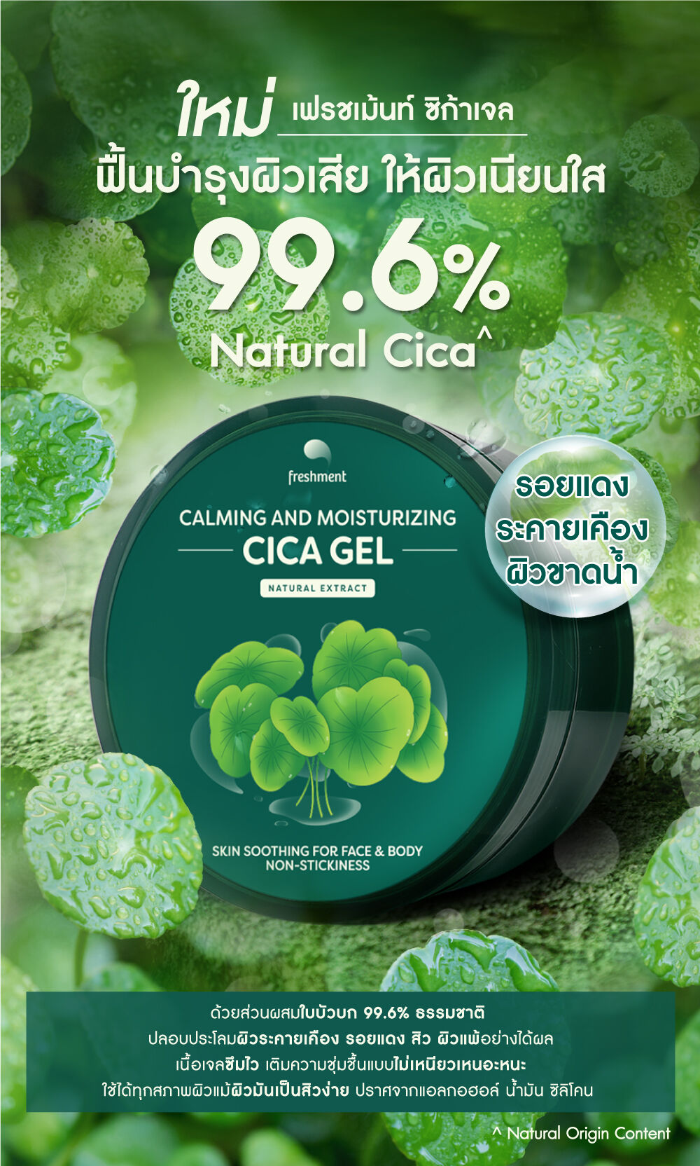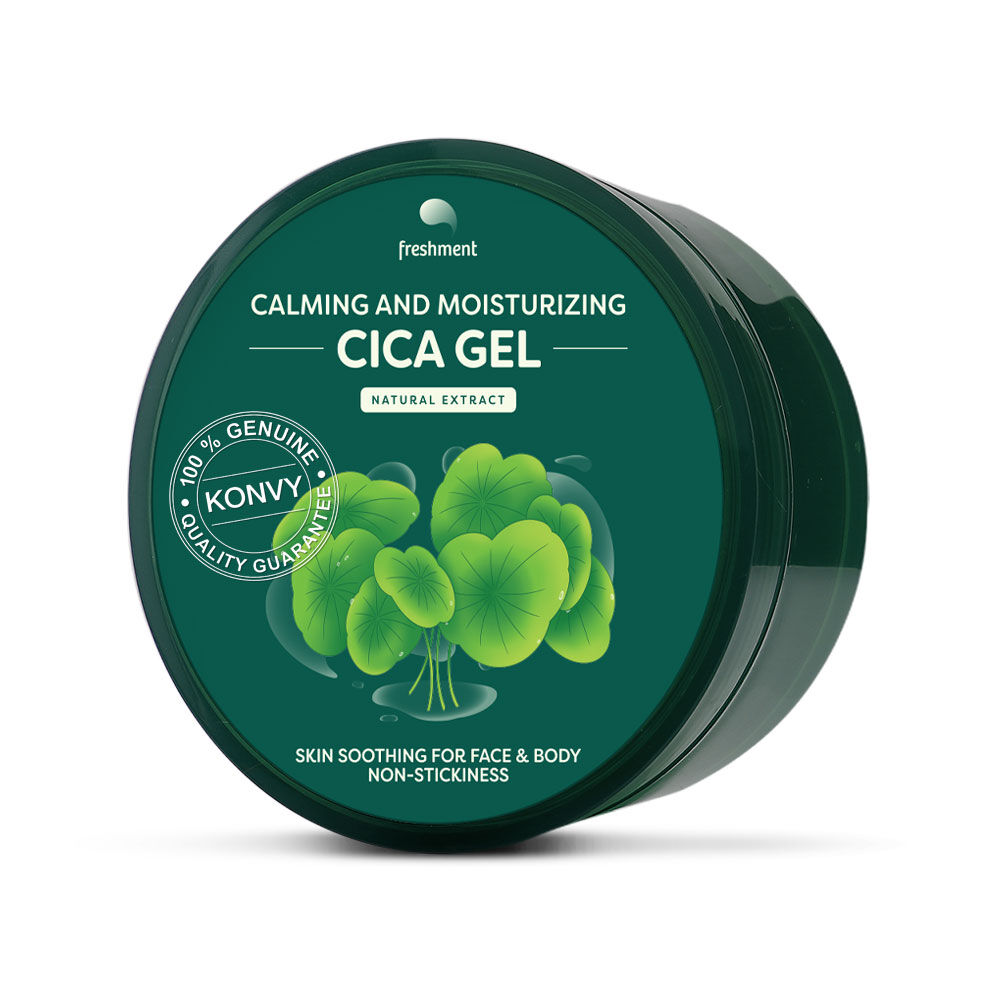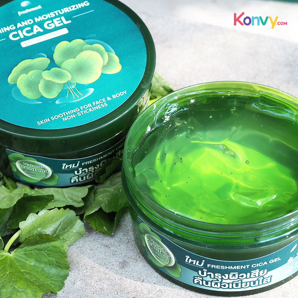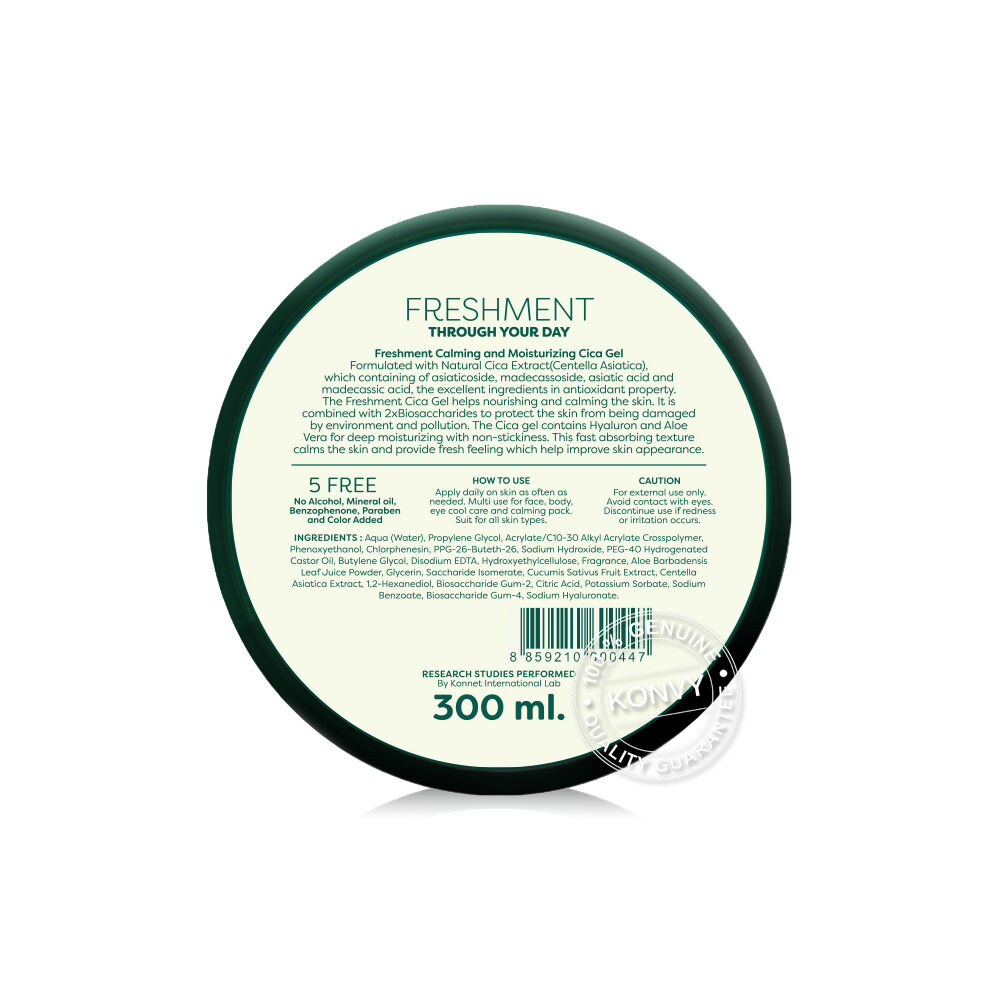 Freshment Calming & Moisturizing Cica Gel 300ml เจลฟื้นบำรุงผิวสูตรเข้มข้น 99.6% Natural Cica ปลอบประโลมผิวระคายเคือง รอยแดง สิว ผิวแพ้ เติมความชุ่มชิ้น บำรุงผิวเรียบเนียน เนื้อเจลเบาสบาย ไม่ทิ้งความมันเหนียวเหนอะหนะ เหมาะกับทุกสภาพผิวแม้ผิวมัน เป็นสิวง่าย ใช้ได้ทั้งผิวหน้าและผิวกาย ทาได้บ่อยเท่าที่ต้องการ