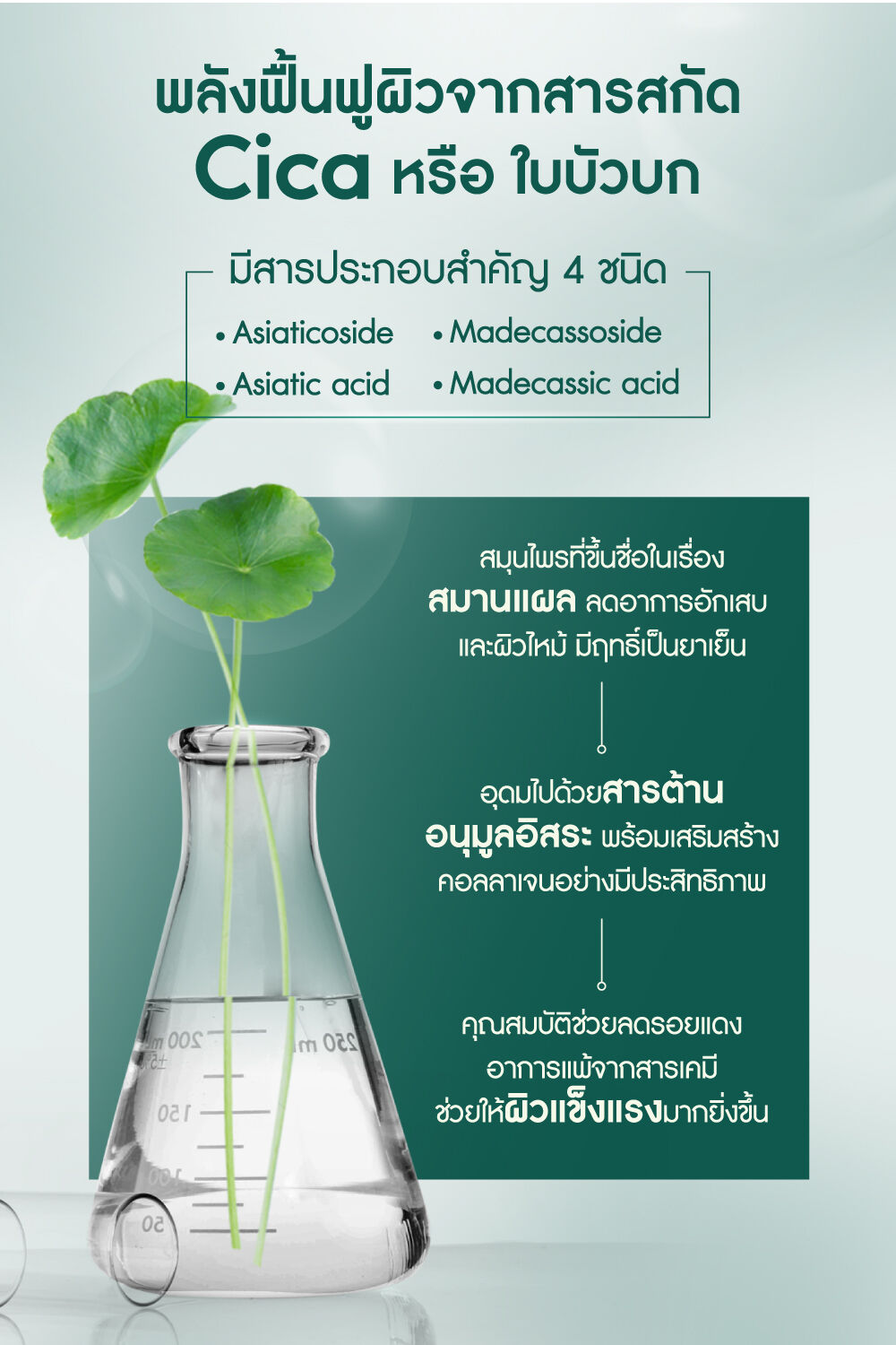 • 99.6% Natural Cica ส่วนผสมใบบัวบกธรรมชาติ อ่อนโยนแม้ผิวบอบบาง