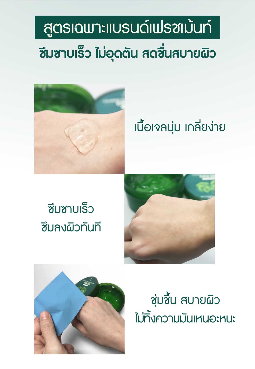 • สูตรซึมไว เบาสบาย ไม่เหนอะผิว ใช้ได้ทุกสภาพผิวแม้ผิวมันเป็นสิวง่าย
