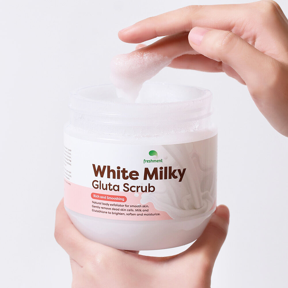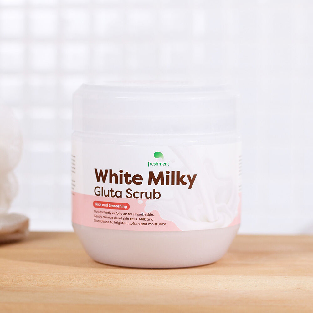 Freshment White Milky Gluta Scrub 700g สครับขัดผิวสูตรน้ำนมกลูต้า เพื่อผิวนุ่มเนียนสวย ช่วยผลัดเซลล์ผิวเสื่อมสภาพ พร้อมออร์แกนิคอัลมอนด์ออยล์ เพิ่มความชุ่มชื้น ฟื้นบำรุงผิวที่หยาบกร้าน ให้ผิวนุ่ม เนียนสวย ดูอ่อนเยาว์ สดใส