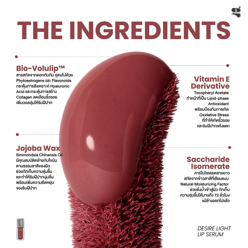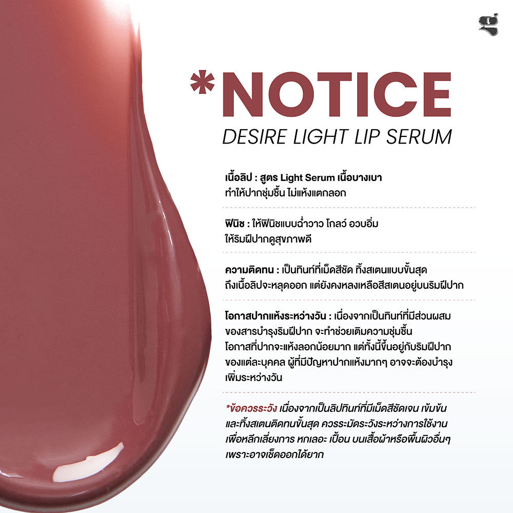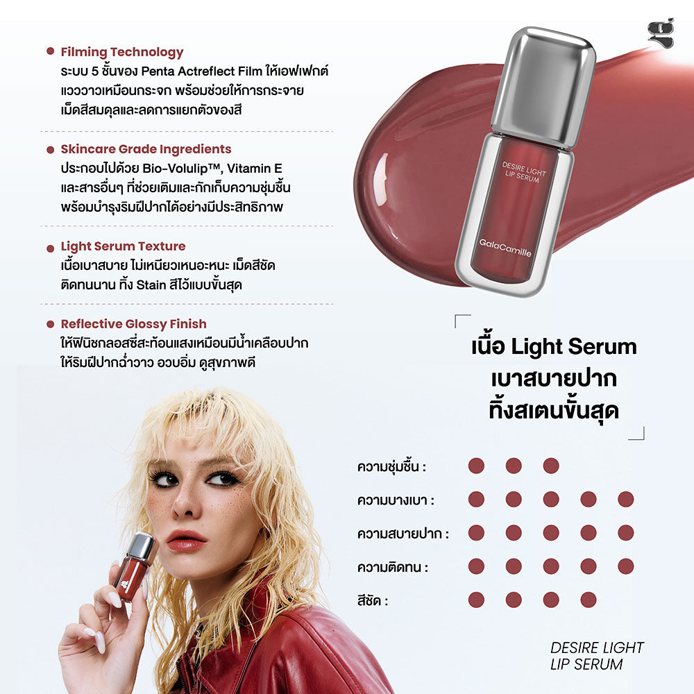 GALA CAMILLE Desire Light Lip Serum 3.5g #08 Slow Down ลิปทินท์เนื้อเซรั่ม เนื้อ Light Serum สูตรบางเบา สบายปาก ให้เม็ดสีชัด พร้อมทิ้งสเตนสีแบบขั้นสุดหลังจากความวาวหลุดออกไป เม็ดสีเกาะปากติดทนนาน ให้ฟินิชฉ่ำวาว กลอสซี่ สะท้อนแสง ริมฝีปากรู้สึกนุ่มลื่นชุ่มชื้น ไม่ทำให้ปากแห้งลอก