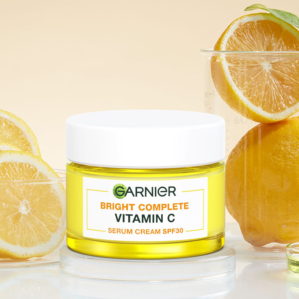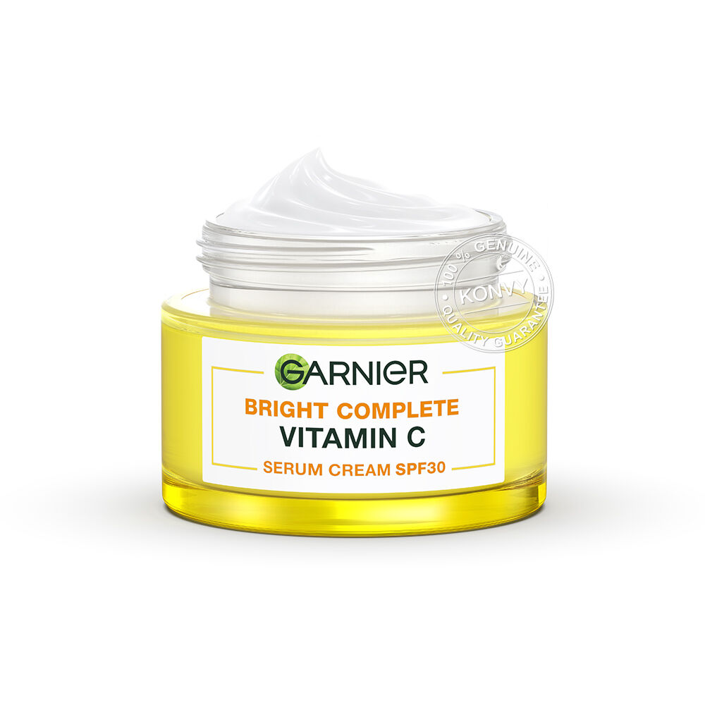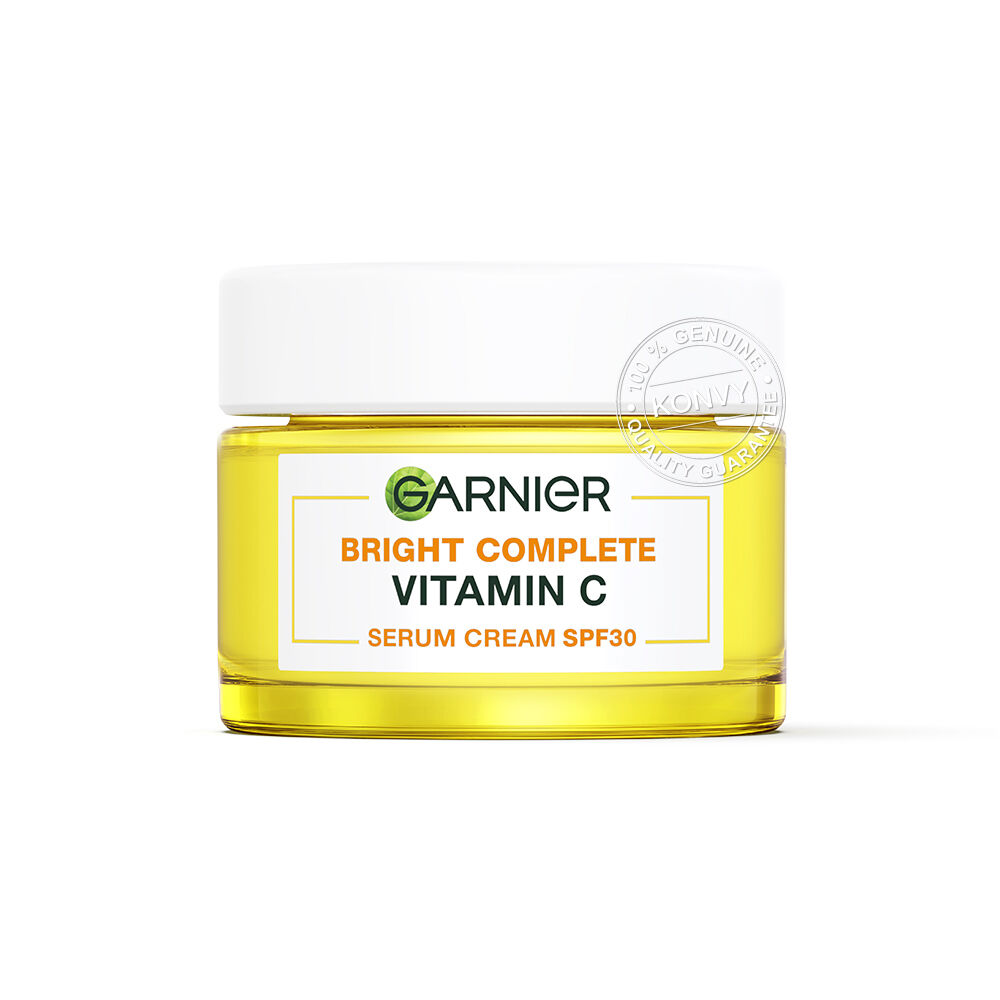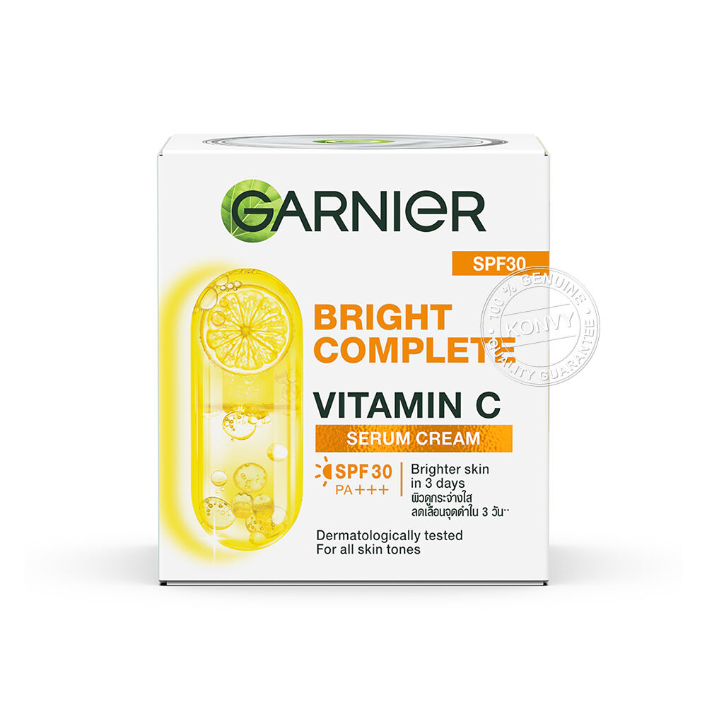 Garnier Bright Complete Vitamin C Serum Cream SPF30 PA+++ 50ml เซรั่มครีมบำรุงผิวหน้า เนื้อสัมผัสบางเบา ซึมซาบเข้าสู่ผิวได้เร็ว ผสานสารสกัดบริสุทธิ์จากยูซุเลมอนสดและวิตามินซีเข้มข้นสูง ช่วยผลัดผิวหมองคล้ำให้ดูสดใส พร้อมปกป้องผิวจากแสงแดดด้วย SPF30/PA+++ เพื่อผิวดูสดใส เปล่งประกาย และมีชีวิตชีวา