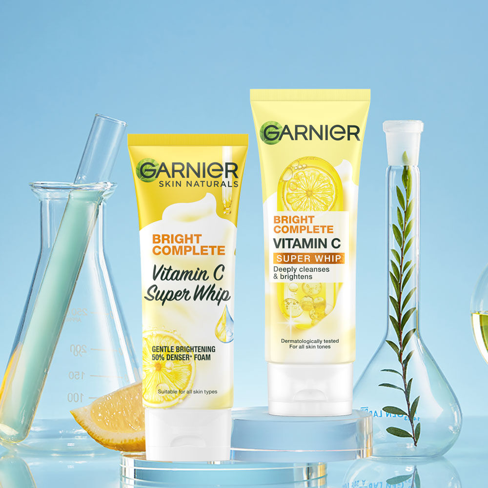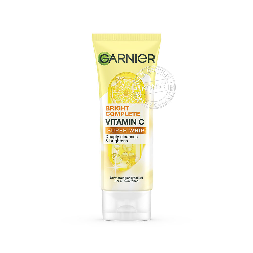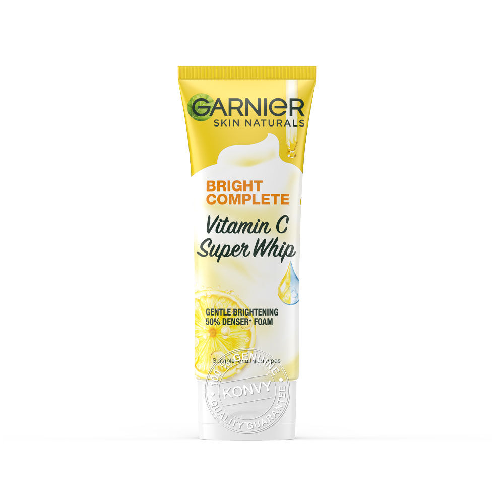 Garnier Bright Complete Vitamin C Super Whip [100ml x 2pcs] วิปโฟมล้างหน้า เนื้อโฟมเนียนละเอียด ด้วยฟองโฟมละเอียดเนื้อวิปหนานุ่ม ทำหน้าที่เหมือนคุชชั่น ช่วยลดการเสียดสีระหว่างมือและหน้า ทำความสะอาดผิวอย่างล้ำลึก ผสานคุณค่ายูซุเลมอน และวิตามินซี ช่วยขจัดความหมองคล้ำ สูตรปราศจากแอลกอฮอล์ ไม่ทำให้ผิวแห้งตึง จึงให้คุณเผยผิวสะอาดดูกระจ่างใสขึ้นเนียนนุ่มดุจผิวเด็ก ใช้ได้แม้ผิวที่บอบบางแพ้ง่าย