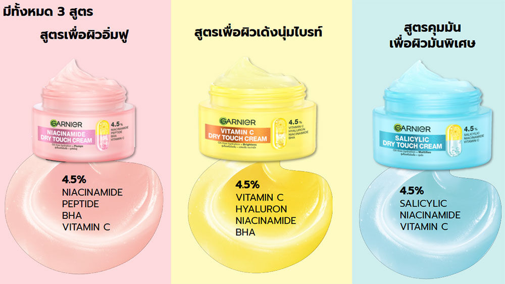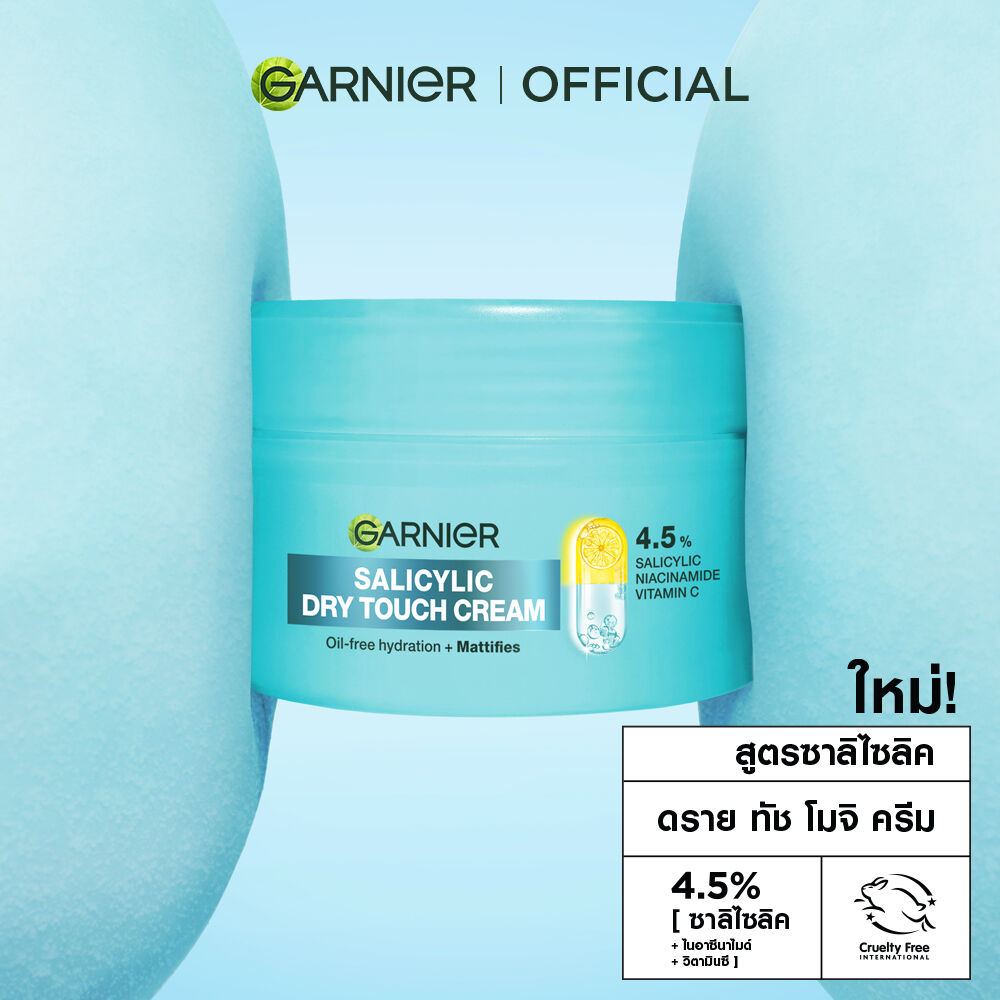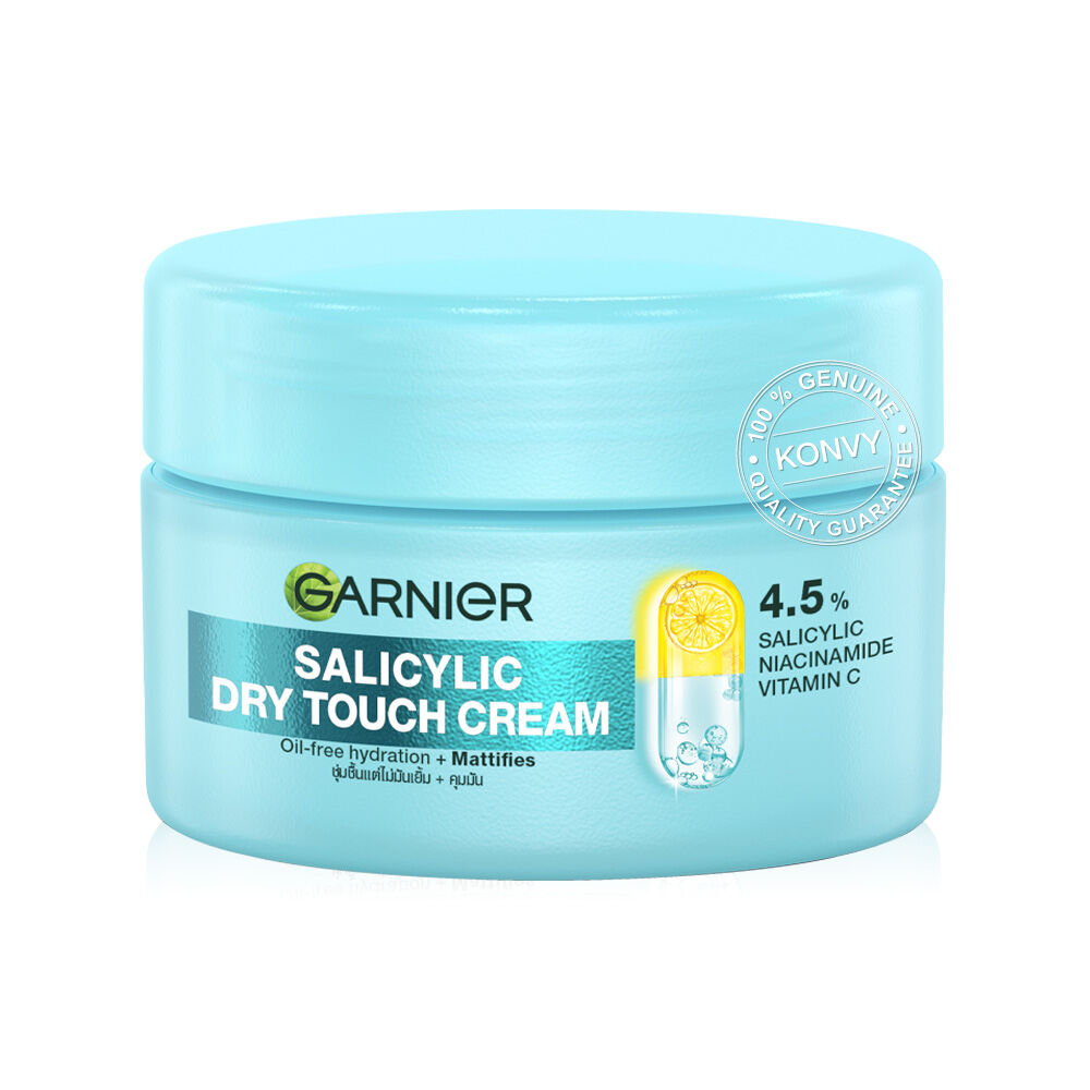 Garnier Salicylic Dry Touch Cream 50ml ครีมบำรุงผิวหน้า สูตรซาลิไซลิค เนื้อโมจิเนียนนุ่ม สัมผัสบางเบาพิเศษ สบายผิว ไม่เหนียวเหนอะหนะ ผสานส่วนผสม 4.5% ของ Salicylic, Niacinamide และ Vitamin C ช่วยเติมความชุ่มชื้น ลดเลือนจุดด่างดำ และปรับผิวให้แลดูกระจ่างใส พร้อมควบคุมความมันยาวนาน เหมาะสำหรับผู้ที่มีผิวมันขาดน้ำ เผยผิวเนียนนุ่ม ไม่มัน ดูอิ่มน้ำสุขภาพดี