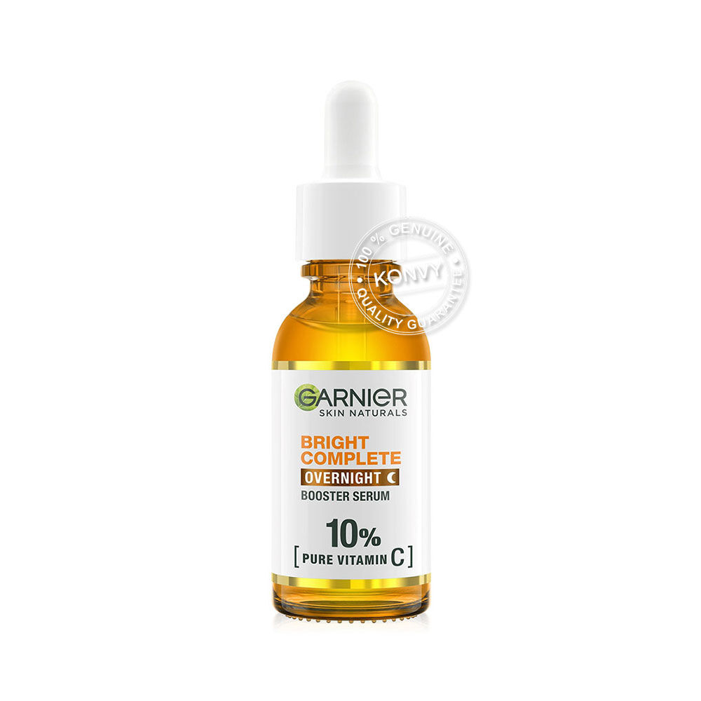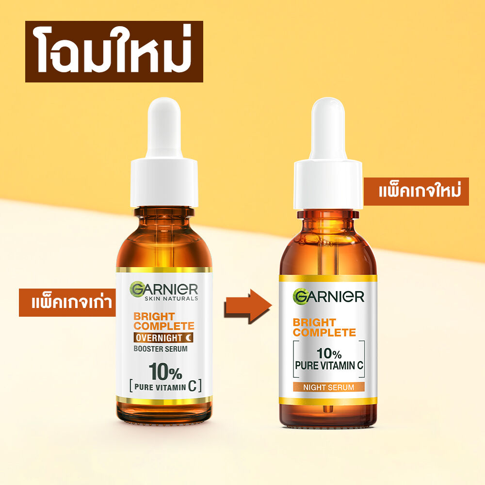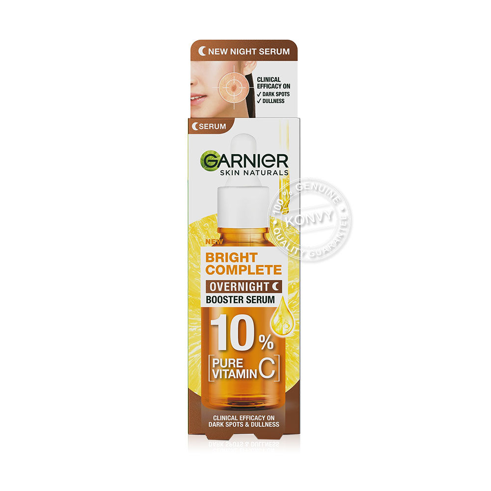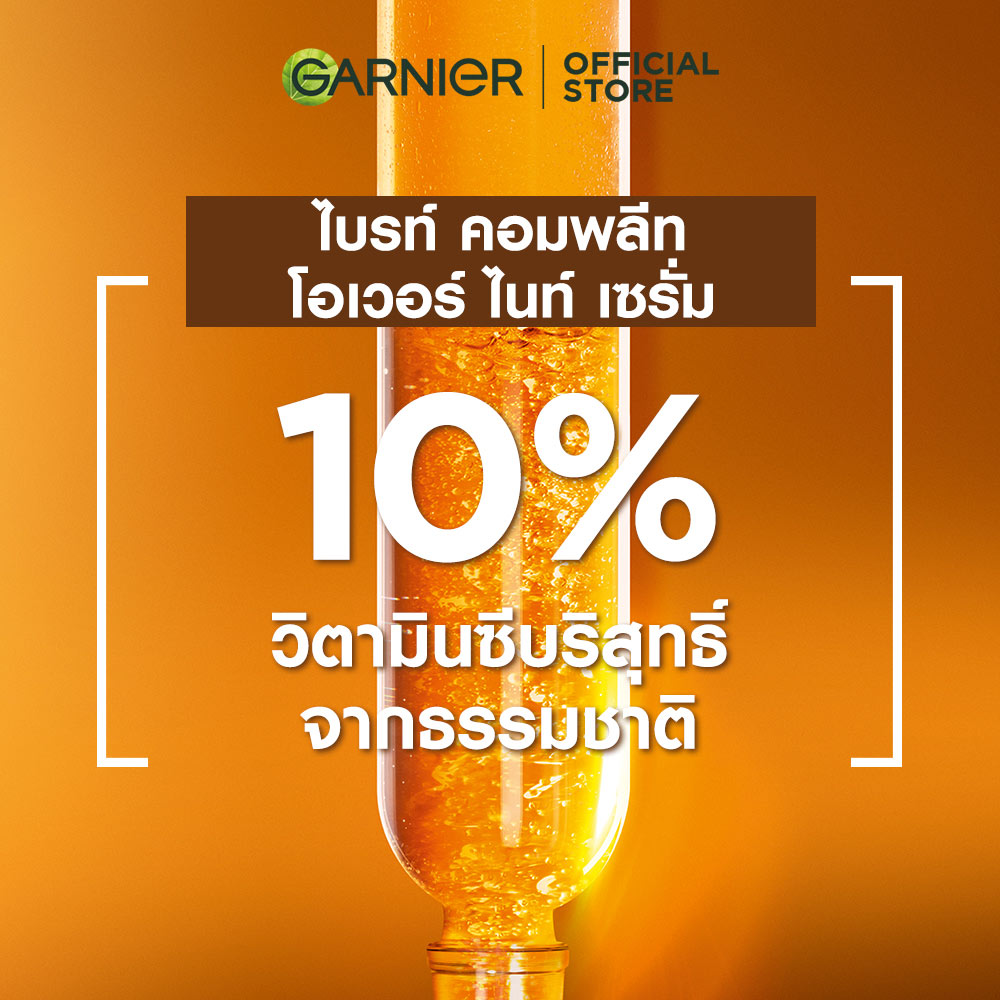 Garnier Skin Naturals Bright Complete Overnight Booster Serum 30ml เซรั่มสูตรกลางคืน ครั้งแรกกับ 10% วิตามินซีบริสุทธิ์ที่มีความเข้มข้นสูงสุดและทรงประสิทธิภาพสำหรับเวลากลางคืน ให้คุณตื่นมาพร้อมกับผิวดูกระจ่างใส นุ่มชุ่มชื้น เด้งฟู เนื้อเซรั่มตรงเข้าบำรุงผิวอย่างล้ำลึก รู้สึกสบายผิว บางเบา ซึมไว ไม่เหนอะหนะ