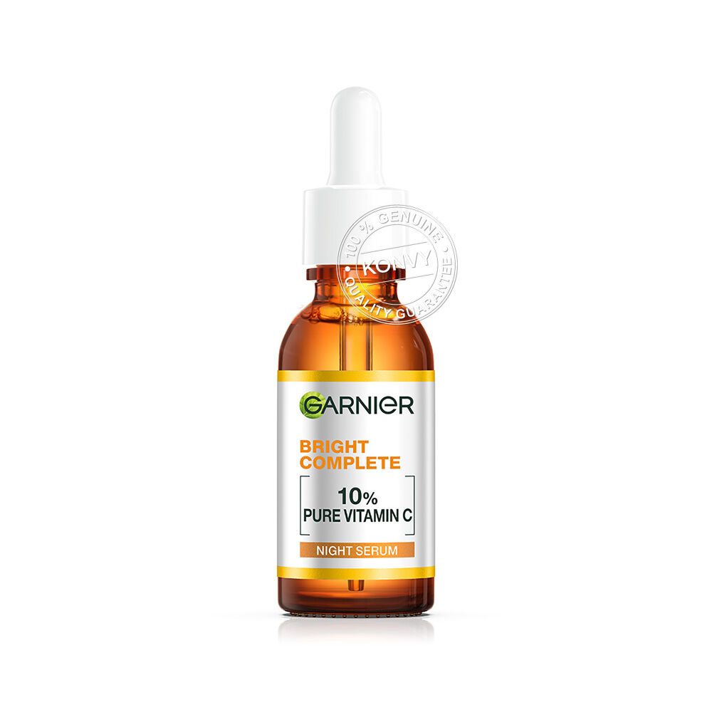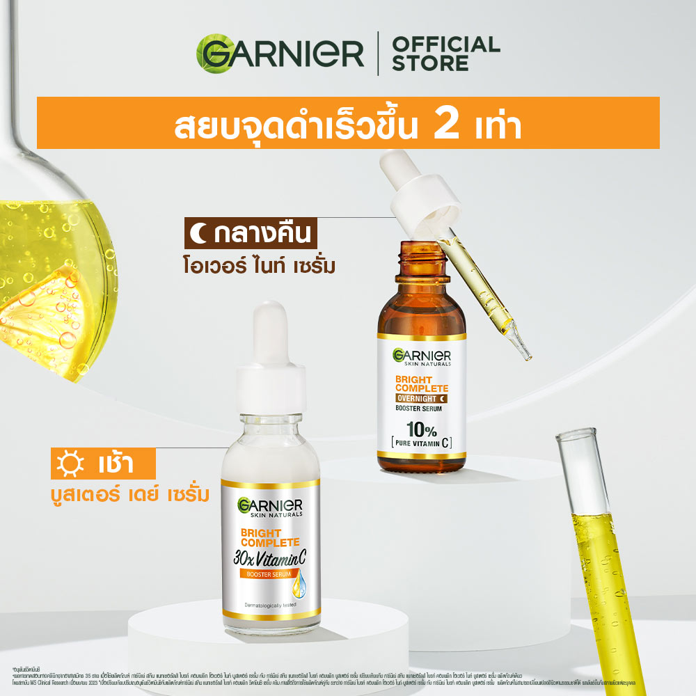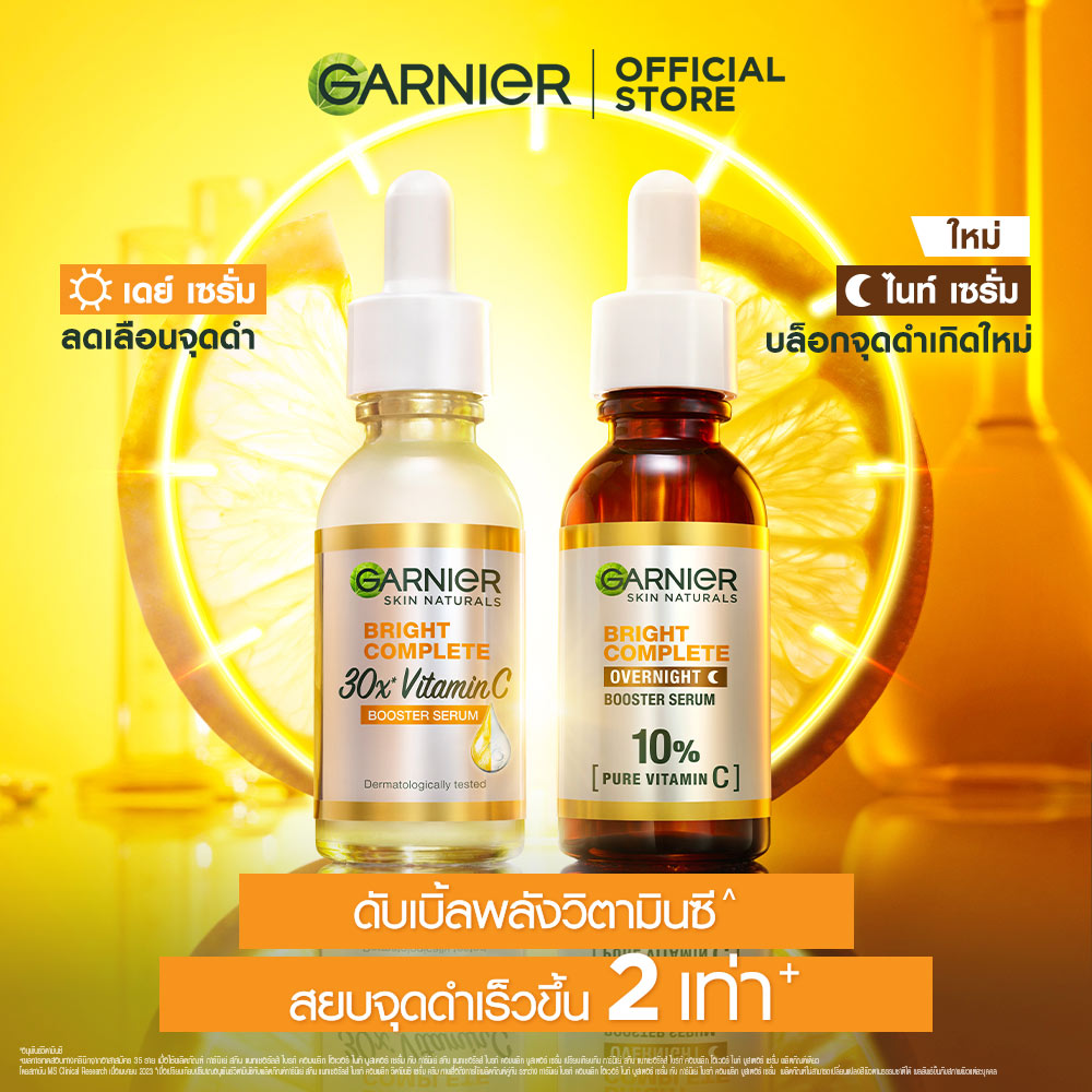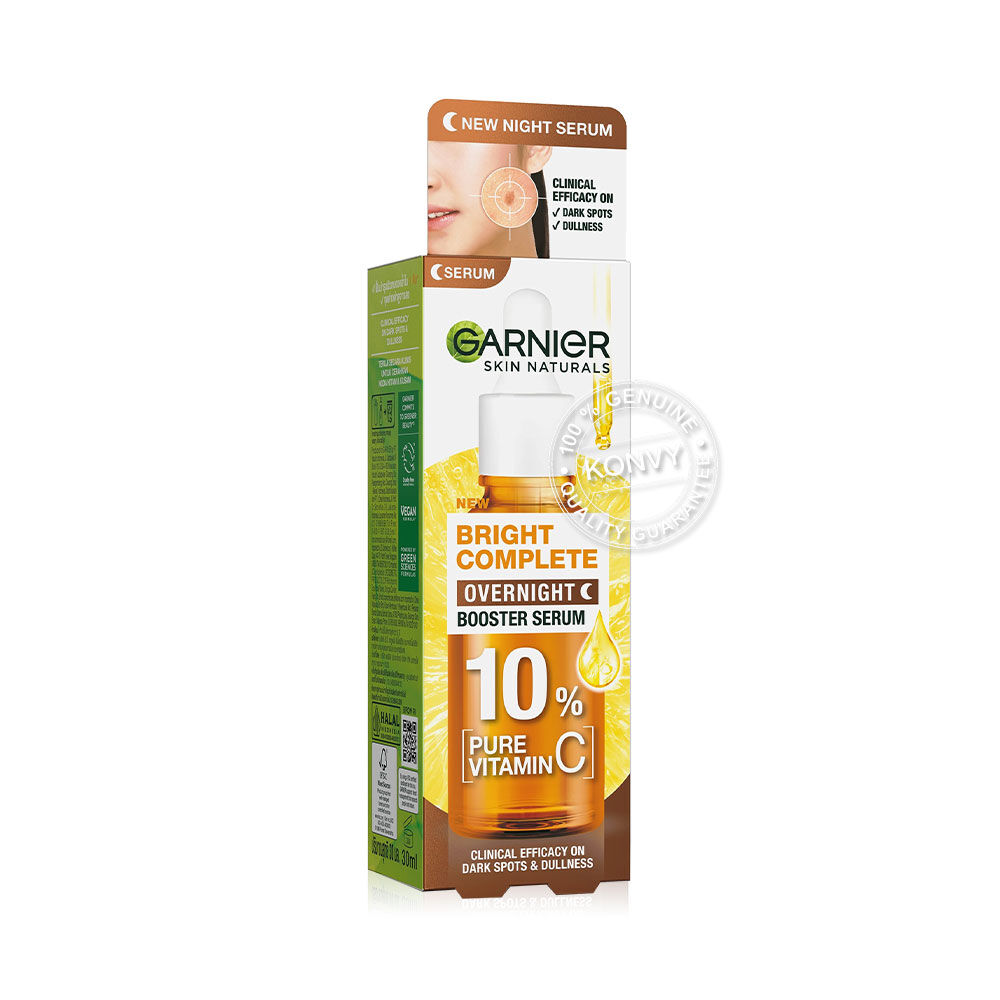 Garnier Skin Naturals Bright Complete Overnight Booster Serum 30ml เซรั่มสูตรกลางคืน ครั้งแรกกับ 10% วิตามินซีบริสุทธิ์ที่มีความเข้มข้นสูงสุดและทรงประสิทธิภาพสำหรับเวลากลางคืน ให้คุณตื่นมาพร้อมกับผิวดูกระจ่างใส นุ่มชุ่มชื้น เด้งฟู เนื้อเซรั่มตรงเข้าบำรุงผิวอย่างล้ำลึก รู้สึกสบายผิว บางเบา ซึมไว ไม่เหนอะหนะ