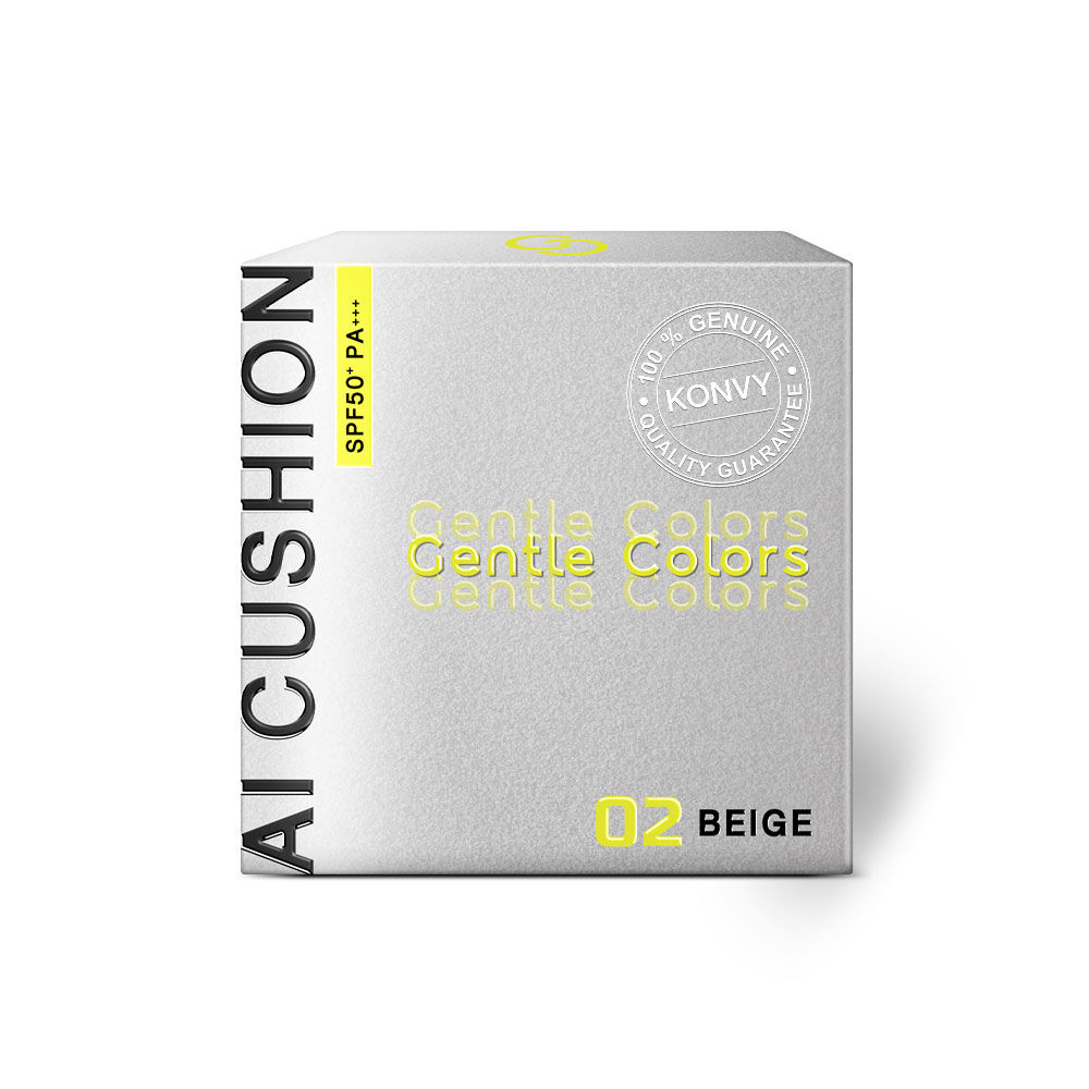 Gentle Colors Ai Cushion SPF50+ PA+++ 10g #02 Beige คุชชั่นเอไอ เนื้อบางเบาสบายผิว คุมมันยาวนาน กันน้ำ กันเหงื่อ ไม่ดรอป ไม่เป็นคราบ ติดทนนาน มีเทคโนโลยี AI Film Technology ช่วยเบลอรูขุมขน และปกปิดจุดด่างดำ ให้เรียบเนียน พร้อมผสานสารสกัดจากดอกคาโมมายล์ ช่วยปลอบประโลมผิวจากรังสี UV มอบฟินิชผิวแมทสวยไร้ที่ติ เนียนเป๊ะตลอดวัน