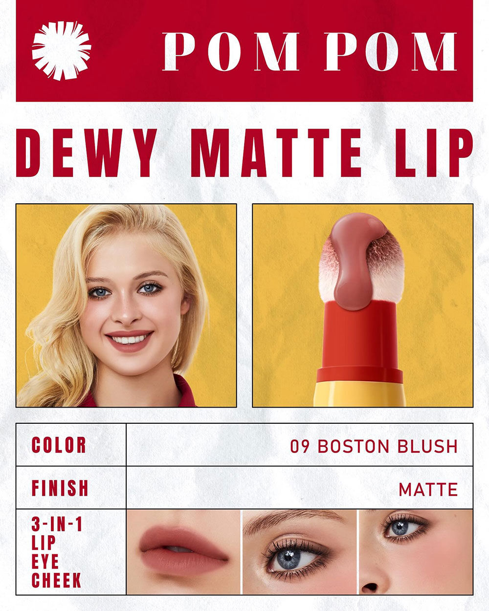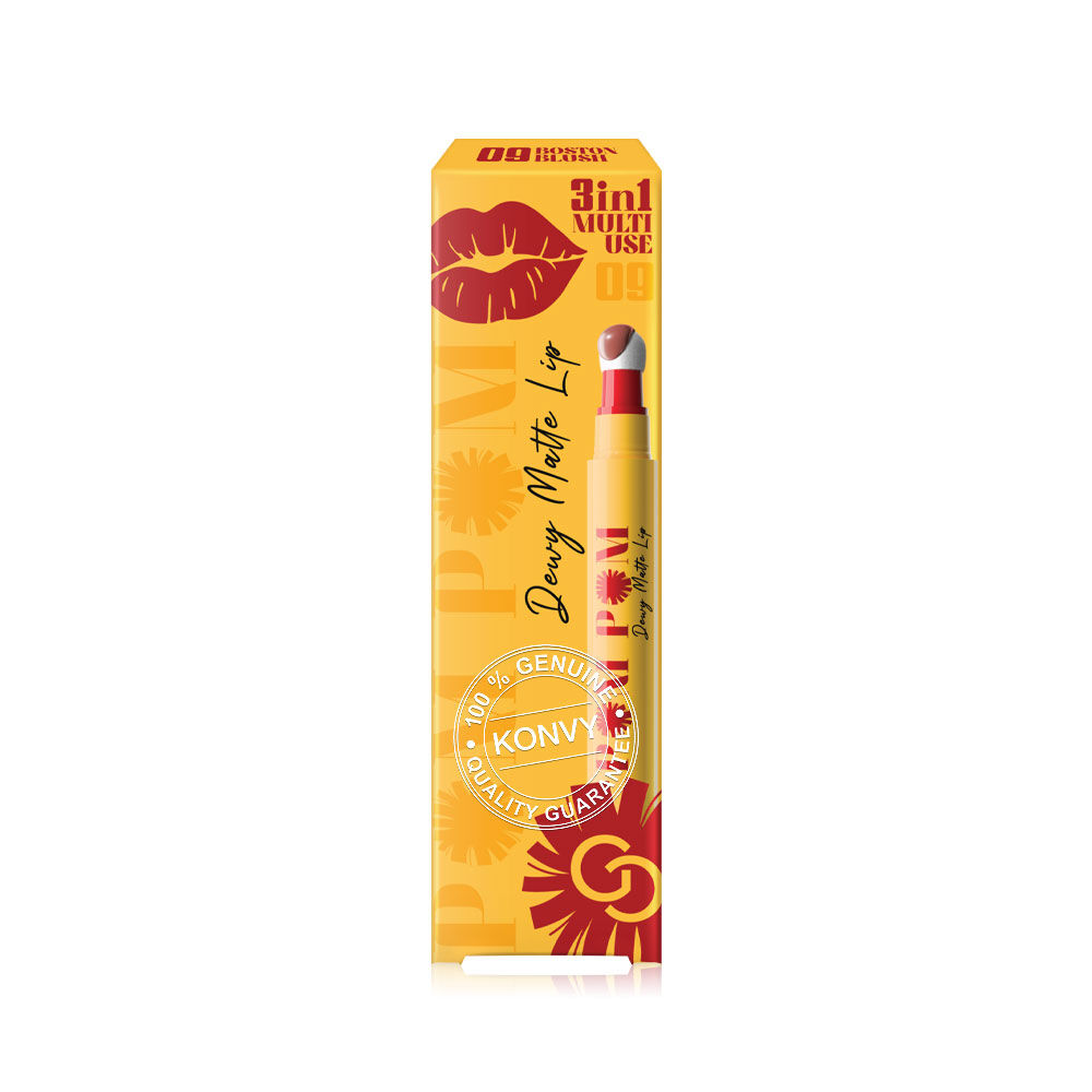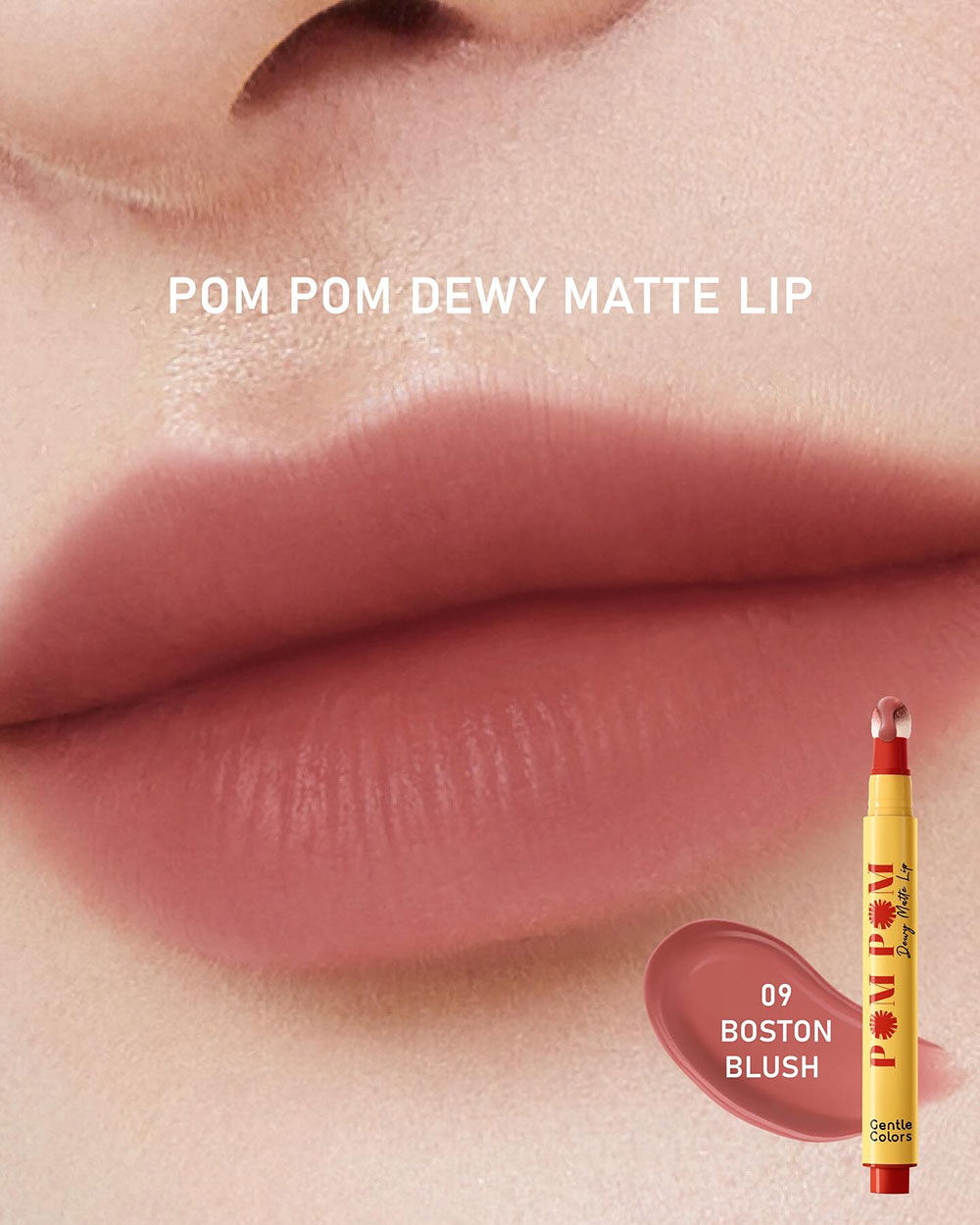 Gentle Colors Pom Pom Dewy Matte Lip 2.5g #09 Boston Blush ลิปหัวปอมปอม เนื้อดิวอี้แมท เม็ดสีชัด ติดทนนาน ด้วยเทคโนโลยี Elasto-Film Technology มาพร้อมนวัตกรรม Blender Blur Effect หัวแปรงฟองน้ำ ช่วยให้เกลี่ยเนื้อลิปให้ฟุ้งสวย ผสานสารบำรุงจาก Vitamin E และ Jojoba Oil ช่วยบำรุงริมฝีปากให้เนียนนุ่ม ชุ่มชื้น มอบริมฝีปากเบลอสวย ดูดิวอี้ สุขภาพดี