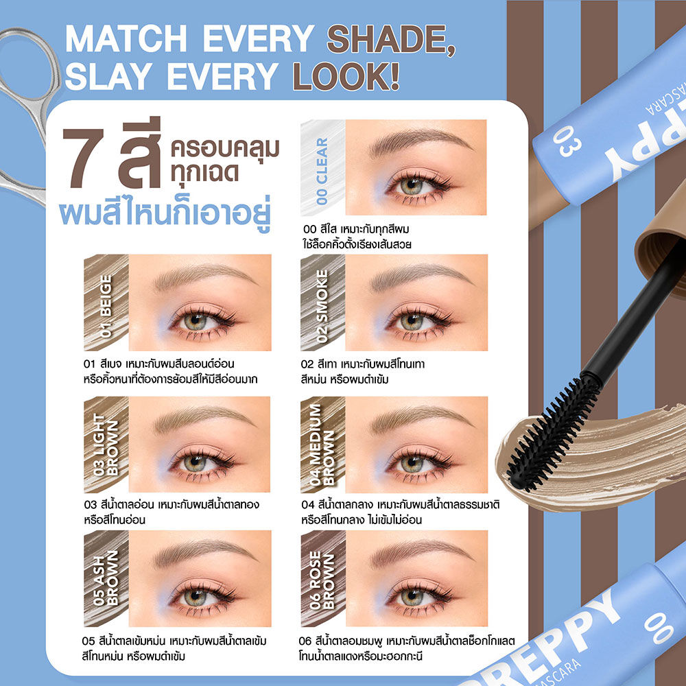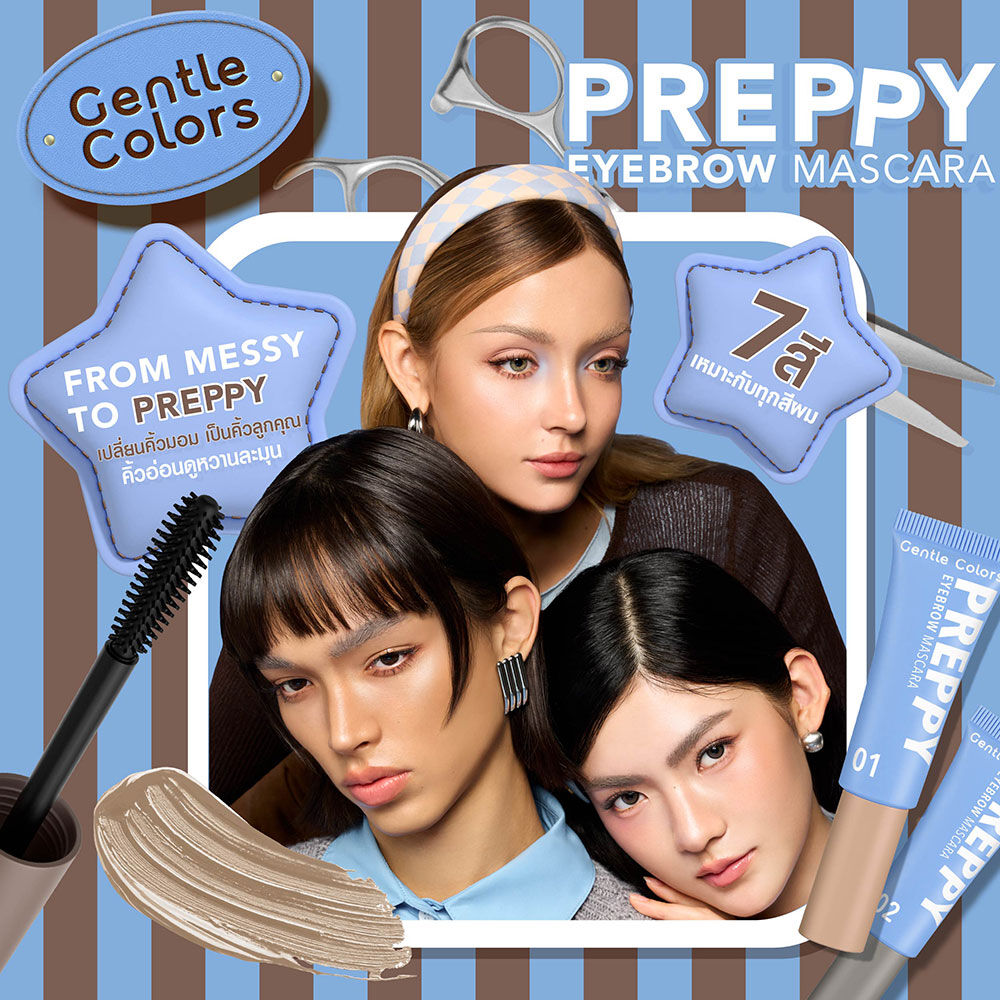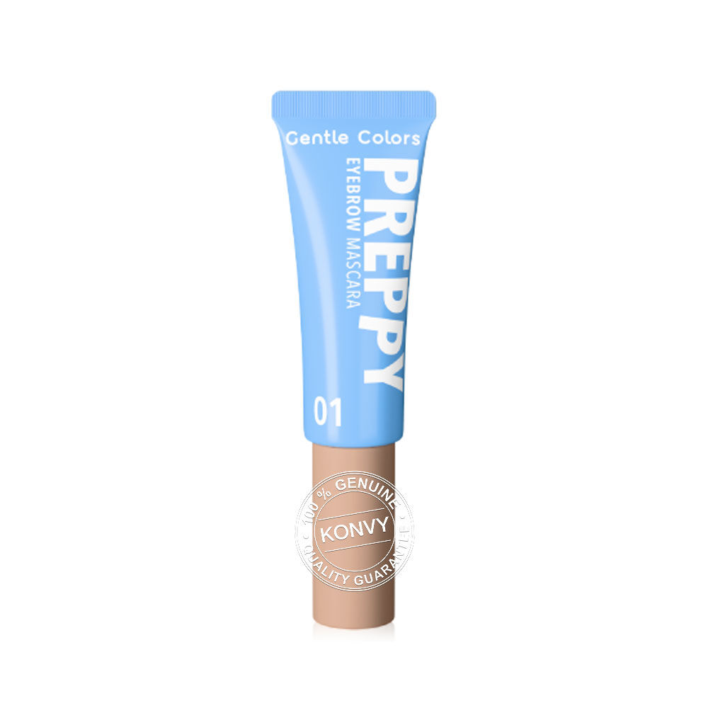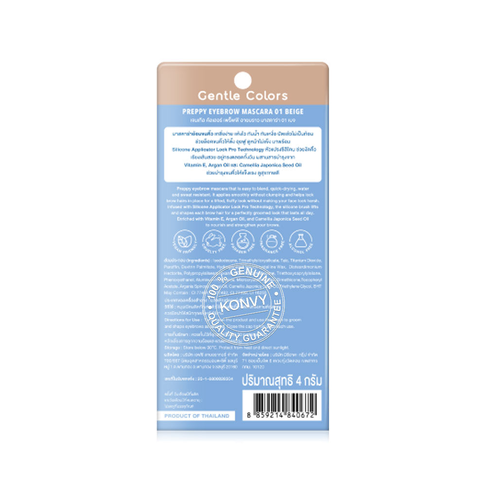 Gentle Colors Preppy Eyebrow Mascara 4g #01 Beige มาสคาร่าคิ้ว เกลี่ยง่าย แห้งไว กันน้ำ กันเหงื่อ ไม่จับตัวเป็นก้อน มาพร้อมนวัตกรรม Silicone Applicator Lock Pro Technology หัวแปรงซิลิโคน ช่วยปัดคิ้วให้เรียงเส้นสวยอยู่ทรงตลอดวัน ผสาน Vitamin E, Argan Oil และ Camellia Japonica Seed Oil ช่วยบำรุงให้ขนคิ้วดูแข็งแรง สุขภาพดี