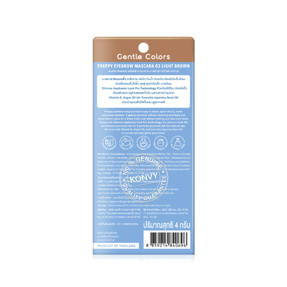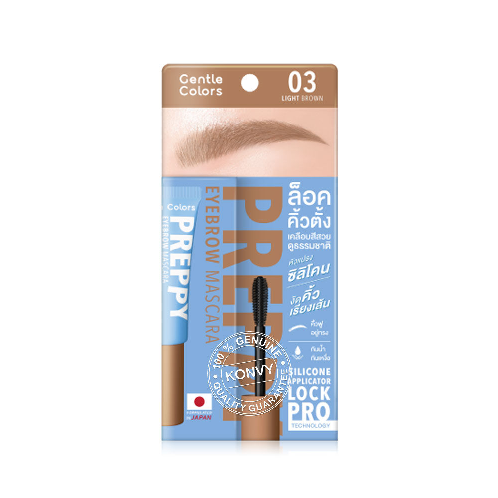 Gentle Colors Preppy Eyebrow Mascara 4g #03 Light Brown มาสคาร่าคิ้ว เกลี่ยง่าย แห้งไว กันน้ำ กันเหงื่อ ไม่จับตัวเป็นก้อน มาพร้อมนวัตกรรม Silicone Applicator Lock Pro Technology หัวแปรงซิลิโคน ช่วยปัดคิ้วให้เรียงเส้นสวยอยู่ทรงตลอดวัน ผสาน Vitamin E, Argan Oil และ Camellia Japonica Seed Oil ช่วยบำรุงให้ขนคิ้วดูแข็งแรง สุขภาพดี