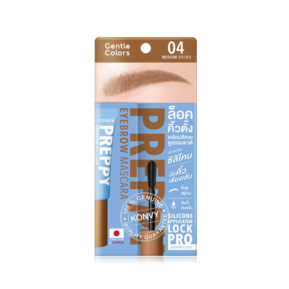 Gentle Colors Preppy Eyebrow Mascara 4g #04 Medium Brown มาสคาร่าคิ้ว เกลี่ยง่าย แห้งไว กันน้ำ กันเหงื่อ ไม่จับตัวเป็นก้อน มาพร้อมนวัตกรรม Silicone Applicator Lock Pro Technology หัวแปรงซิลิโคน ช่วยปัดคิ้วให้เรียงเส้นสวยอยู่ทรงตลอดวัน ผสาน Vitamin E, Argan Oil และ Camellia Japonica Seed Oil ช่วยบำรุงให้ขนคิ้วดูแข็งแรง สุขภาพดี