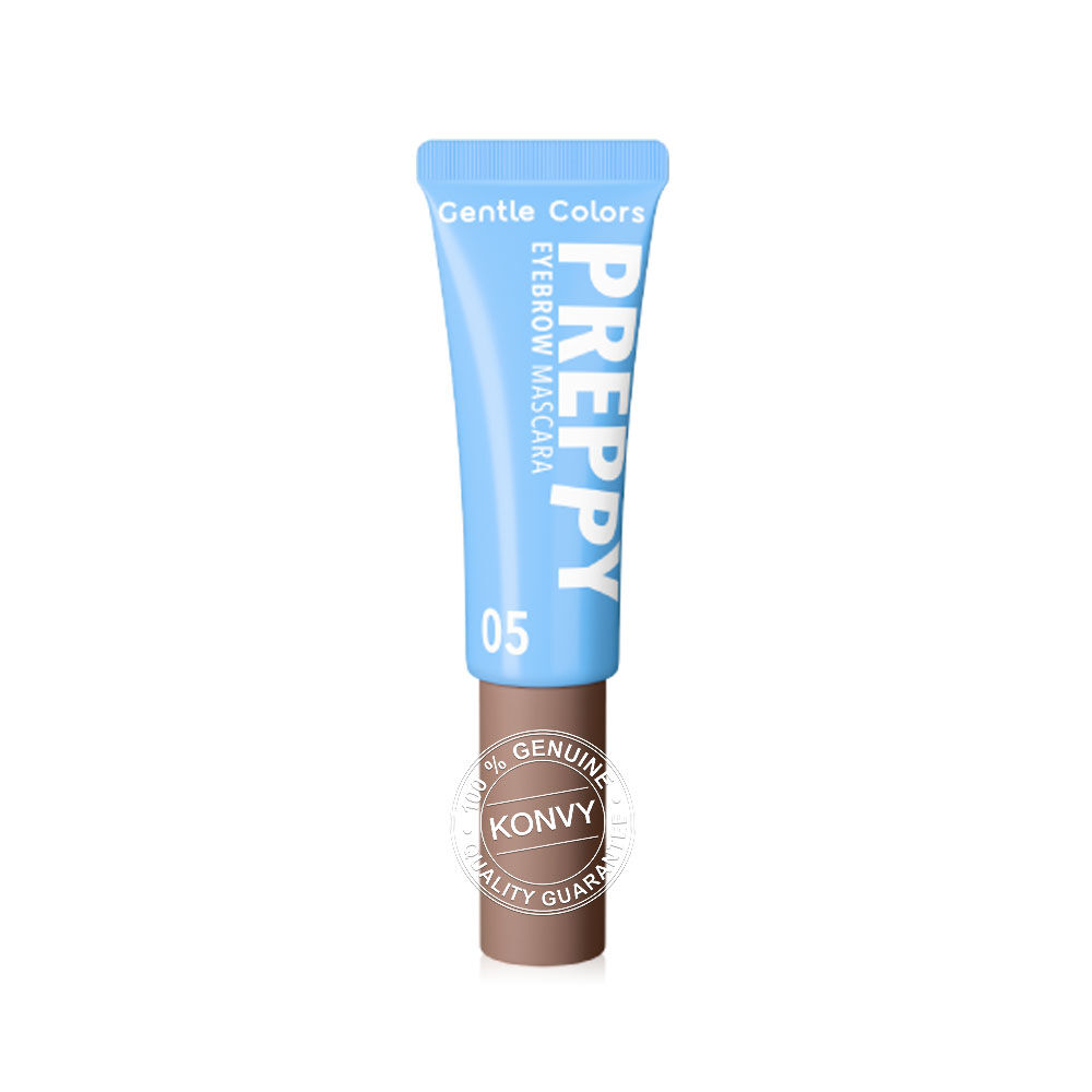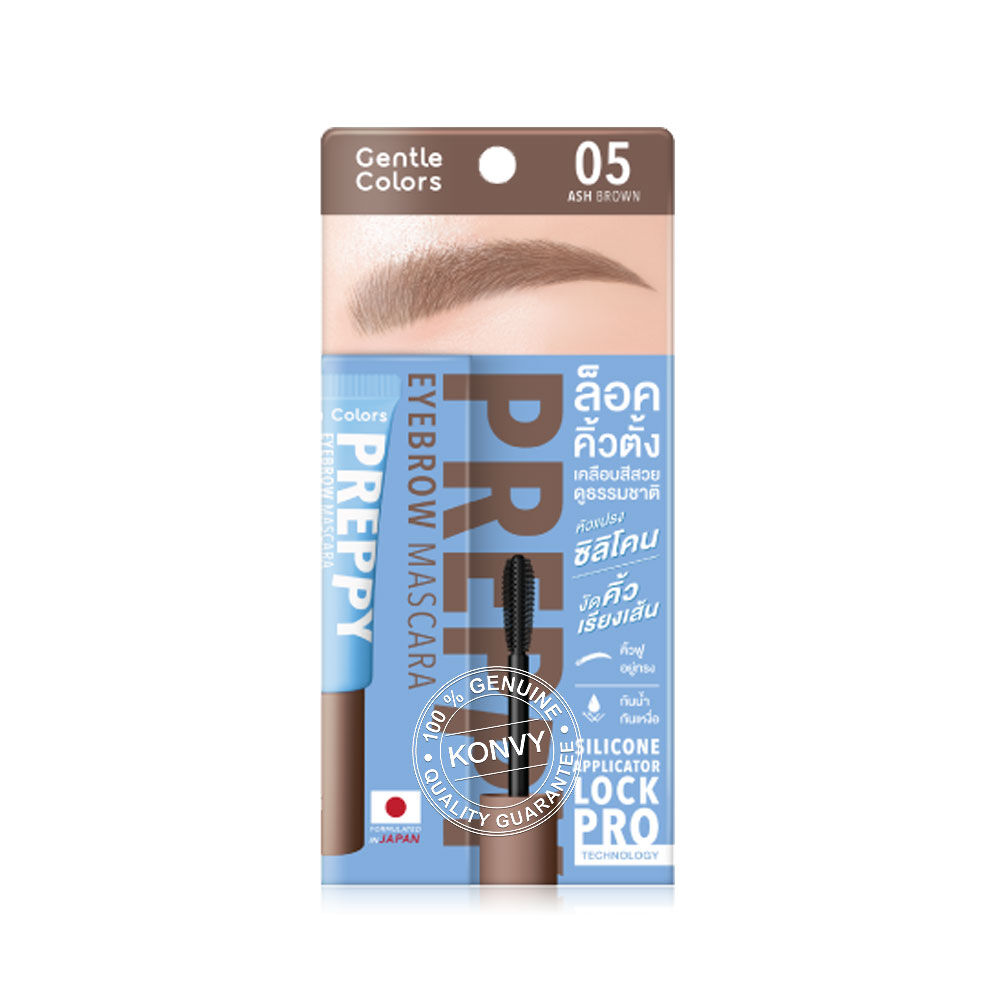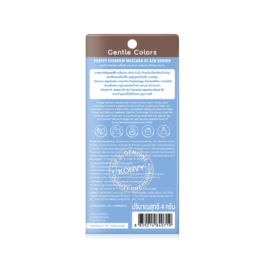 Gentle Colors Preppy Eyebrow Mascara 4g #05 Ash Brown มาสคาร่าคิ้ว เกลี่ยง่าย แห้งไว กันน้ำ กันเหงื่อ ไม่จับตัวเป็นก้อน มาพร้อมนวัตกรรม Silicone Applicator Lock Pro Technology หัวแปรงซิลิโคน ช่วยปัดคิ้วให้เรียงเส้นสวยอยู่ทรงตลอดวัน ผสาน Vitamin E, Argan Oil และ Camellia Japonica Seed Oil ช่วยบำรุงให้ขนคิ้วดูแข็งแรง สุขภาพดี