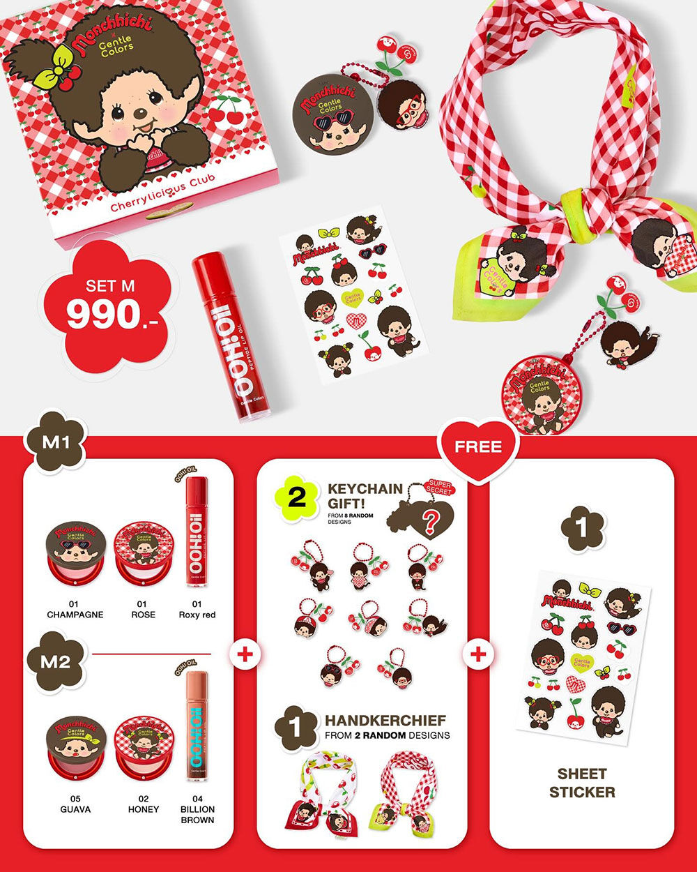 Gentle Colors X Monchchichi Set M1 [Lip Oil 7g #01 Roxy Red + Blush 4g #01 Champagne + Highlighter 4g #01 Rose] เซทลิปออยล์ + บลัชออนและไฮไลท์เนื้อครีม ที่มาในแพ็คเกจคอลเลคชัน Monchchichi สุดน่ารัก