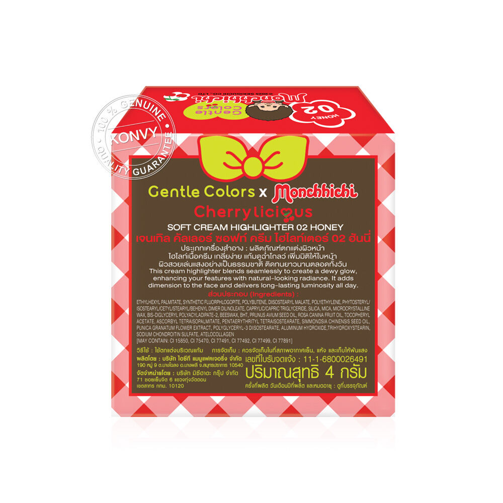 Gentle Colors X Monchchichi Soft Cream Highlighter 4g #02 Honey ไฮไลท์เนื้อครีม ที่มาในแพ็คเกจคอลเลคชัน Monchchichi สุดน่ารัก ให้สัมผัสแบบ Cream to Powder เกลี่ยง่าย ติดทนนาน ช่วยเพิ่มมิติบนใบหน้า พร้อมผสาน Vitamin C และน้ำมันเมล็ดเชอร์รี่ ช่วยบำรุงผิวให้ชุ่มชื้น แลดูกระจ่างใส ให้ฟินิชผิวสวยเล่นแสง ฟุ้งละมุนสไตล์ Monchhichi