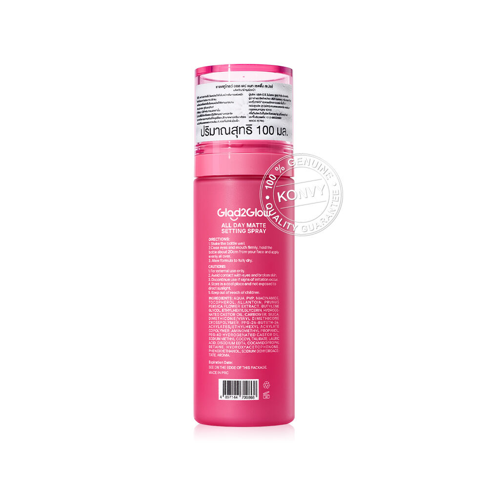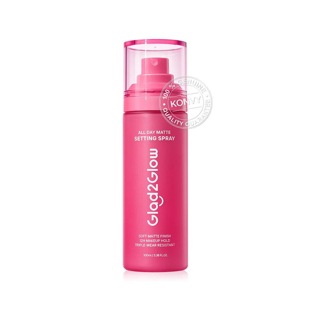Glad2Glow All Day Matte Setting Spray 100ml เซ็ตติ้งสเปรย์ผิวแมท ให้ฟินิชซอฟต์โฟกัสมอบสัมผัสเนียนละมุนดุจแป้ง ช่วยควบคุมความมัน พร้อมล็อกเมคอัพยาวนาน ผสานเทคโนโลยี Triple-Wear Resistant ช่วยกันน้ำ กันเหงื่อ ไม่หลุด ไม่ไหลเยิ้ม เสริมด้วยนวัตกรรม Powder Shield Oil Control Technology ช่วยควบคุมความมันส่วนเกิน เผยผิวแมทเนียนสวยตลอดวัน อุดมด้วยส่วนผสมที่อ่อนโยนต่อผิว ให้ความชุ่มชื้น พร้อมปกป้องผิวจากมลภาวะ