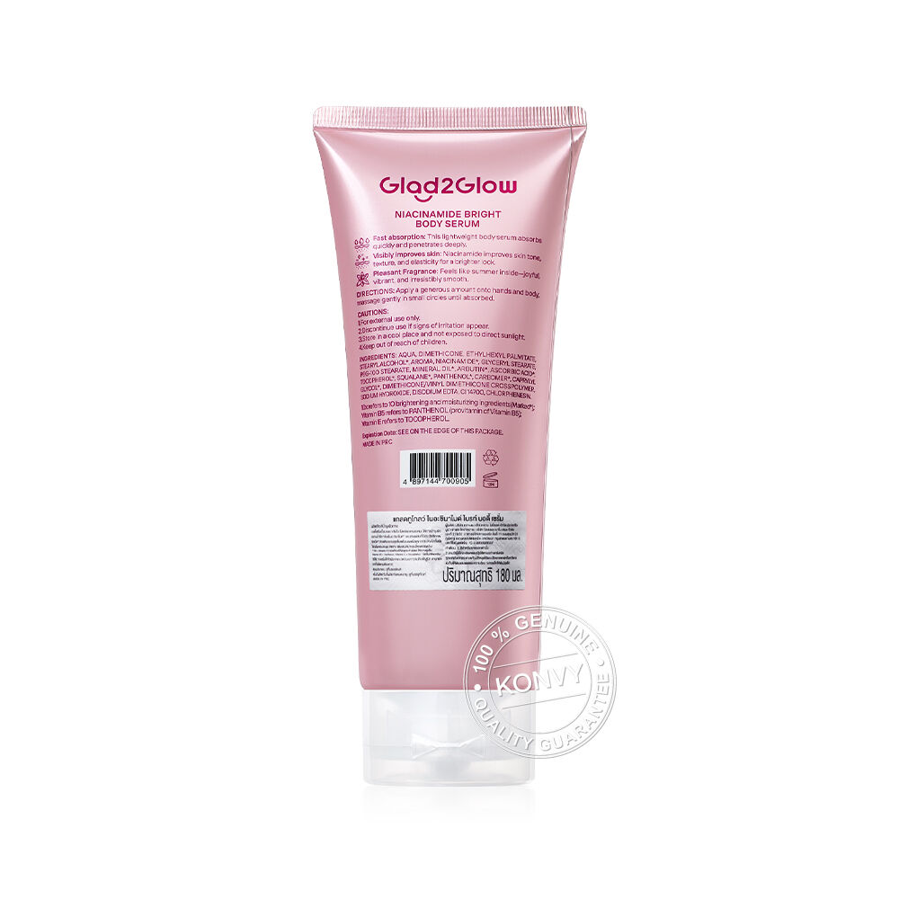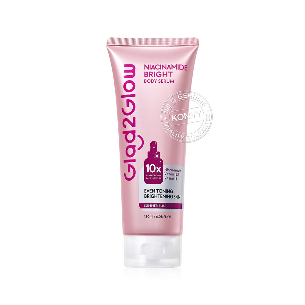 Glad2Glow Niacinamide Bright Body Serum 180ml เซรั่มน้ำหอมบำรุงผิวกาย เนื้อสัมผัสบางเบา ซึมซาบเร็ว ไม่เหนียวเหนอะหนะ มอบความชุ่มชื้นยาวนาน ผสานกับไนอะซินาไมด์ วิตามินบี 5 และวิตามินอี ช่วยให้ผิวดูเนียนนุ่ม พร้อมทั้งเผยผิวดูกระจ่างใสอย่างเป็นธรรมชาติ เสริมด้วยกลิ่นแนวฟรุตตี้จากส้มและดอกไม้ ปิดท้ายด้วยวานิลลาหอมละมุน มอบกลิ่นหอมหวานสดชื่นยาวนานตลอดวัน