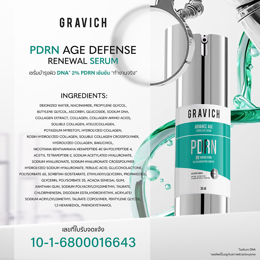 GRAVICH PDRN Age Defense Renewal Serum 30ml เซรั่มสูตรเข้มข้น เพื่อดูแลริ้วรอยและผิวขาดความกระชับ ด้วยการผสานพลังของ Salmon PDRN, Col-Frag Remastered™, Ascorbyl Glucoside, 4X Hyaluron Acid เพื่อบำรุงผิวที่เริ่มมีริ้วรอย เหนื่อยล้า แห้งกร้าน ต้องการการบำรุงที่ล้ำลึก