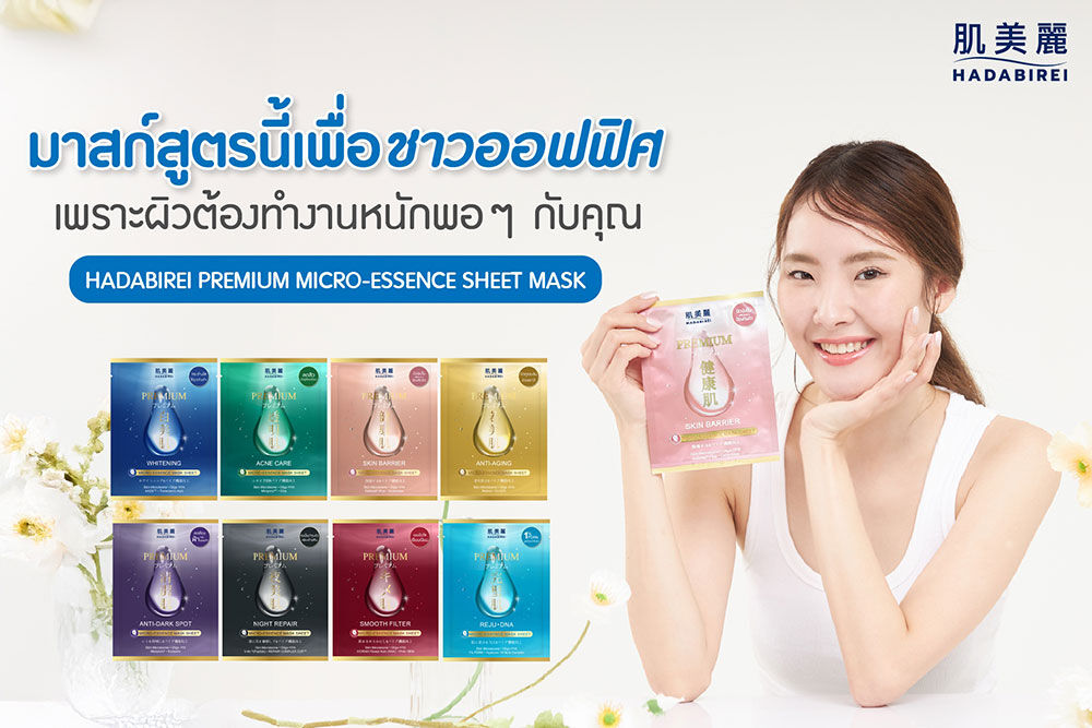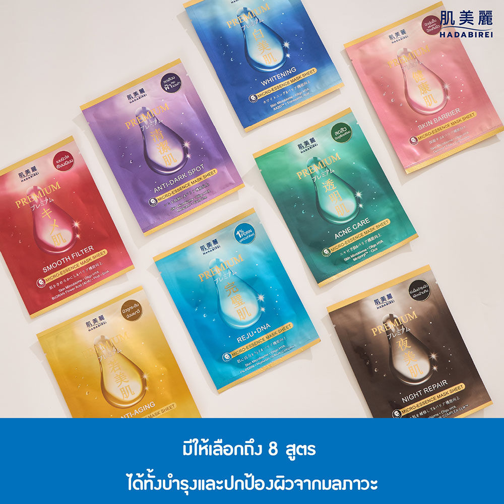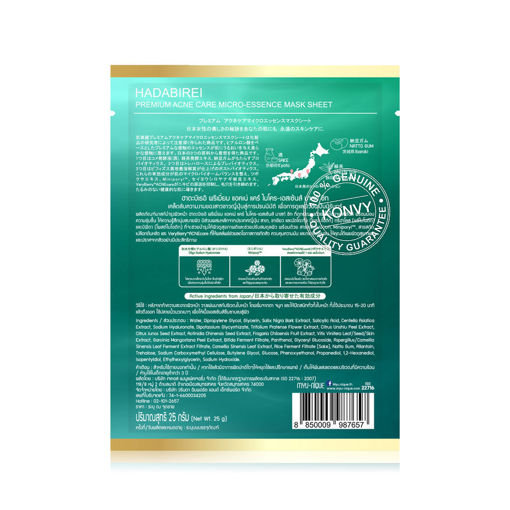 HADABIREI Premium Acne Care Micro-Essence Mask 25g แผ่นมาสก์หน้า ที่ถูกพัฒนาด้วยเนื้อไฮยาเอสเซนส์ พร้อมมอบความชุ่มชื้น และให้ผิวรู้สึกนุ่มสบาย มีส่วนผสมหลักจากประเทศญี่ปุ่น สาเก, ชาเขียว และนัตโตะกัม (โพรไบโอติก) ทรีฮาโลส (พรีไบโอติก) และบิฟิดา (โพสต์ไบโอติก) ที่จะช่วยบำรุงให้ผิวดูสุขภาพดีและช่วยปรับสมดุลเชื้อจุลินทรีย์ในชั้นผิว พร้อมด้วยใบบัวบก, Miniporyl™, สารสกัดเปลือกต้นหลิว และ VeryBerryAcneCare™ ที่ช่วยลดโอกาสการเกิดสิว ควบคุมความมัน และกระชับรูขุมขน ให้คุณได้เผยผิวดูสุขภาพดีและปราศจากสิวอย่างมีประสิทธิภาพ
