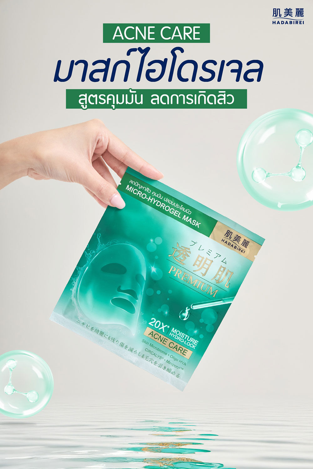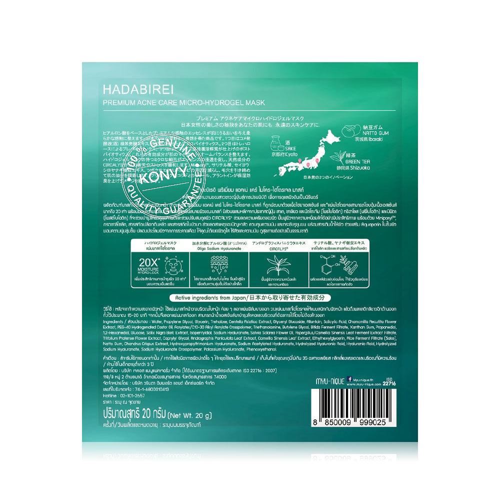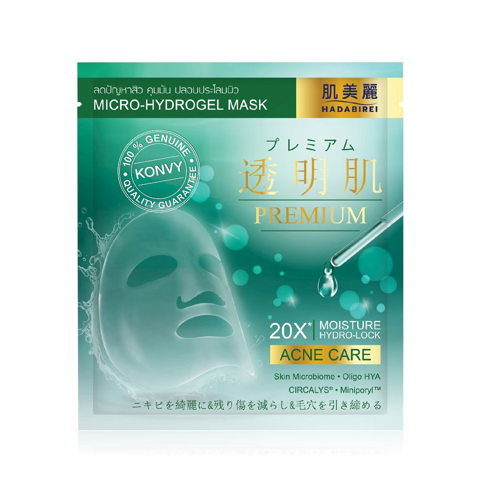 HADABIREI Premium Acne Care Micro-HydroGel Mask 20g แผ่นมาสก์ไฮโดรเจล ที่ถูกพัฒนาด้วยเนื้อไฮยาเอสเซนส์ และแผ่นไฮโดรเจลสามารถโอบอุ้มเนื้อเอสเซนส์มากถึง 20 เท่า พร้อมมอบความชุ่มชื้น ให้ความรู้สึกเย็นสบายผิวขณะมาสก์ มีส่วนผสมหลักจากประเทศญี่ปุ่น สาเก, ชาเขียว และนัตโตะกัม (โพรไบโอติก) ทรีฮาโลส (พรีไบโอติก) และบิฟิดา (โพสต์ไบโอติก) ที่จะช่วยบำรุงให้ผิวดูสุขภาพดีและช่วยปรับสมดุลผิว CIRCALYS® ช่วยลดความเครียดของผิว ฟื้นฟูผิวจากความเหนื่อยล้าได้อย่างมีประสิทธิภาพ พร้อมด้วย Miniporyl™, กรดซาลิไซลิก, สารสกัดเปลือกต้นหลิว และสารสกัดใบบัวบก ช่วยลดสาเหตุของปัญหาสิว ควบคุมความมัน และกระชับรูขุมขน พร้อมสารเติมน้ำให้ผิว ช่วยเสริม Aquaporin ในชั้นผิว มอบความนุ่มชุ่มชื้น ปลอบประโลมผิวจากการระคายเคือง ให้คุณได้เผยผิวดูใส ไร้สิวและความมัน ดูสุขภาพดีอย่างเป็นธรรมชาติ
