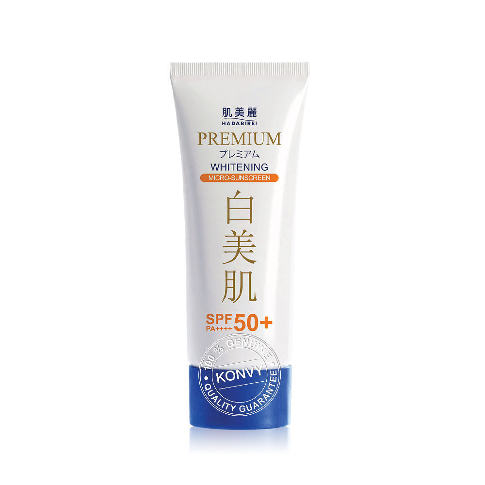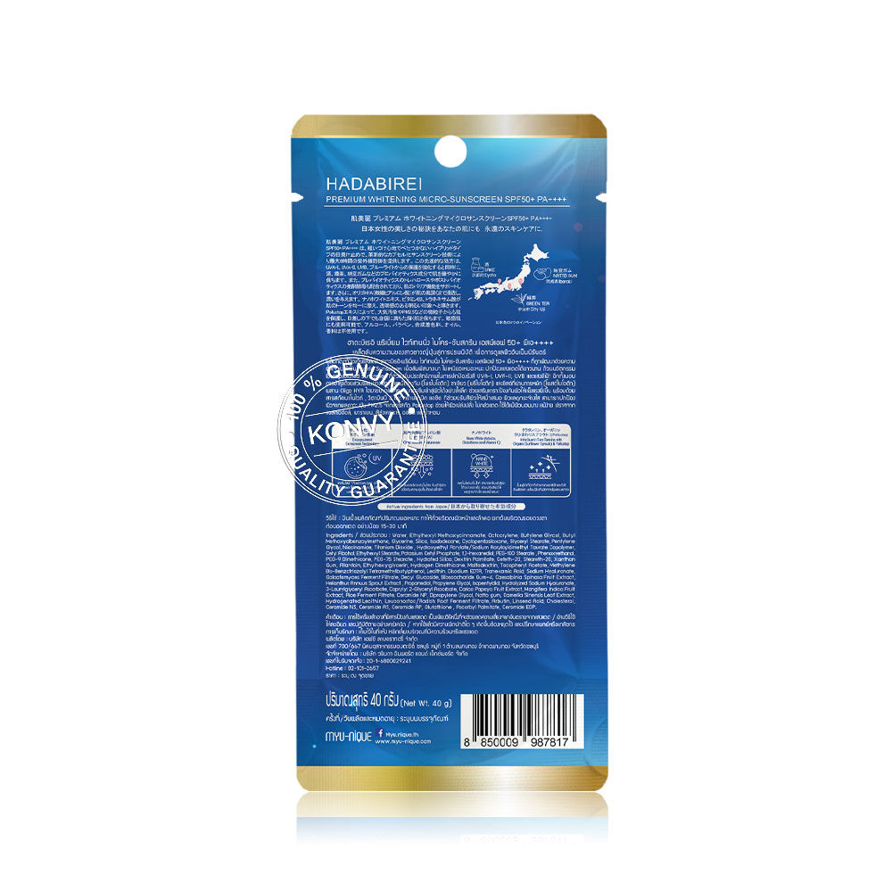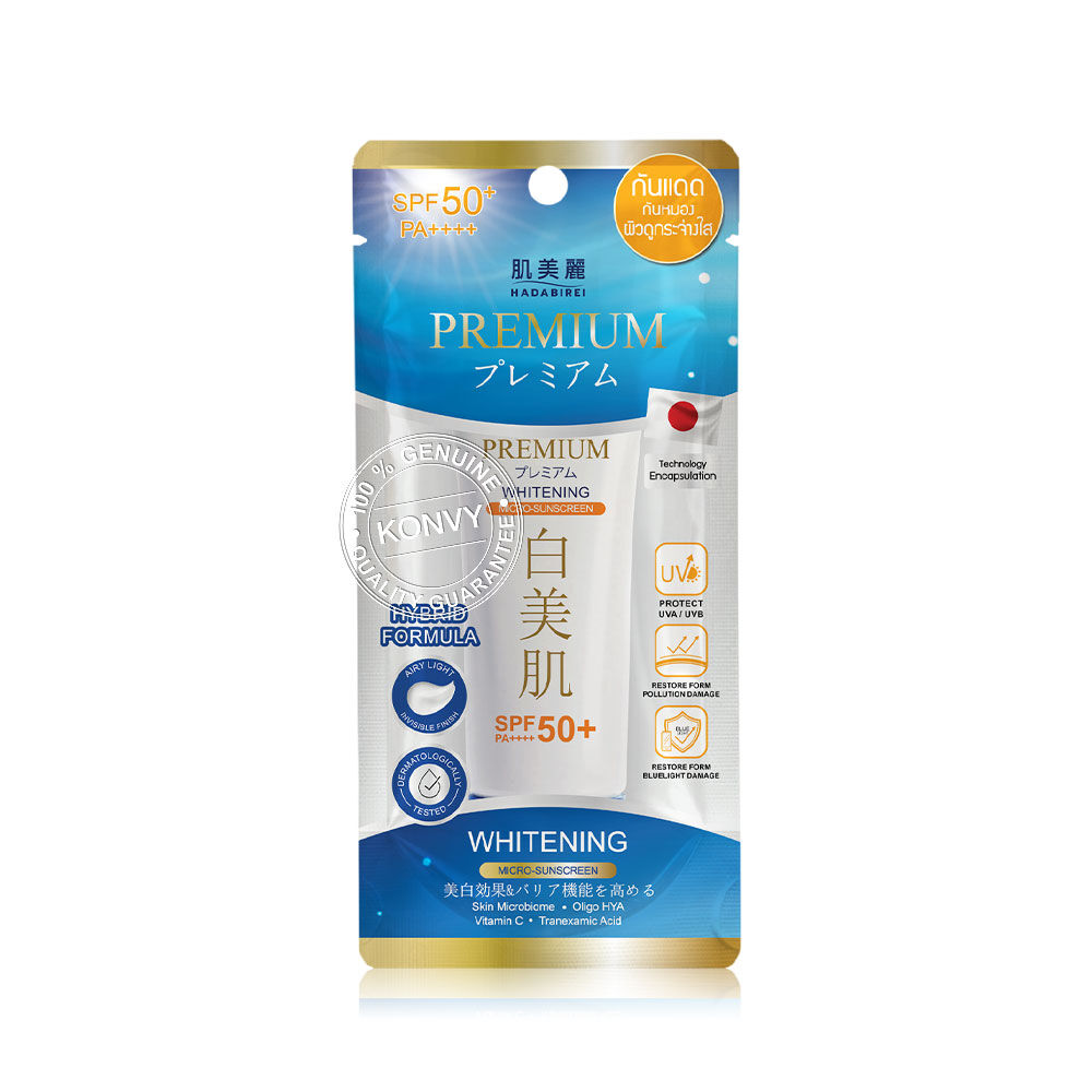HADABIREI Premium Whitening Micro-Sunscreen SPF50+ PA++++ 40g ครีมกันแดดพรีเมียม สูตร Whitening เนื้อสัมผัสบางเบา ไม่เหนียวเหนอะหนะ ด้วยนวัตกรรม Encapsulated Sunscreen ที่ช่วยปกป้องรังสี UVA-I, UVA-II, UVB และแสงสีฟ้าได้ยาวนาน อุดมด้วยสารสกัดจากสาเก, ใบชาเขียว, ถั่วนัตโตะ, Trehalose (Probiotic) และสารสกัดจาก Bifida (Postbiotic) ช่วยปรับสมดุลของผิวให้ดูสุขภาพดี ผสานด้วย Oligo HYA (ไฮยาขนาดไมโคร) ที่สามารถซึมเข้าสู่ผิวได้อย่างล้ำลึก พร้อมกับ Nano-White, Vitamin B3, Vitamin C, Tranexamic Acid, Phyto-Enzyme, Ceramide 5X และ InfraGuard ช่วยลดเลือนความหมองคล้ำ ฝ้า กระ และจุดด่างดำ ปรับสีผิวให้สม่ำเสมอ แลดูกระจ่างใส และเสริมเกราะป้องกันผิวให้แข็งแรง อีกทั้งยังมีสารสกัด Pollustop ช่วยปกป้องผิวจากมลภาวะ ฝุ่น PM2.5 เผยผิวเนียนใส ดูเปล่งปลั่ง มั่นใจตลอดวัน