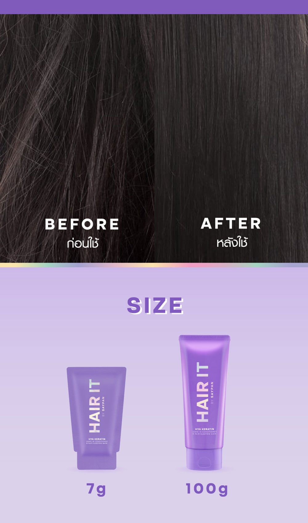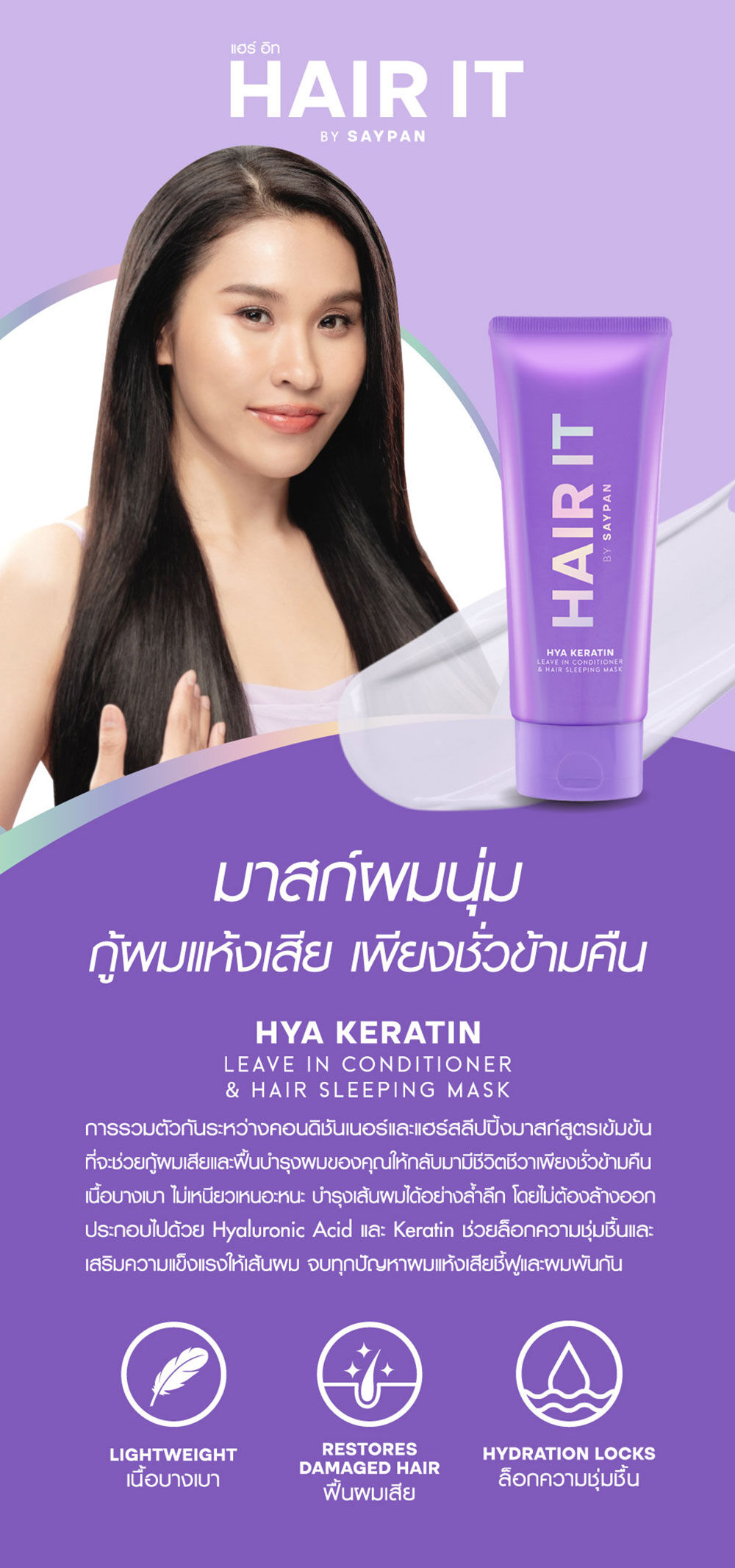 Hair It Hya Keratin Leave In Conditioner & Hair Sleeping Mask 100g การรวมตัวกันระหว่างคอนดิชั่นเนอร์และแฮร์สลีปปิ้งมาสก์สูตรเข้มข้น ที่จะช่วยกู้ผมเสียและฟื้นบำรุงผมของคุณให้กลับมามีชีวิตชีวาเพียงชั่วข้ามคืน เนื้อบางเบา ไม่เหนียวเหนอะหนะ บำรุงเส้นผมได้อย่างล้ำลึกโดยไม่ต้องล้างออก ประกอบไปด้วย Hyaluronic Acid และ Keratin ช่วยล็อกความชุ่มชื้นและเสริมความแข็งแรงให้เส้นผม จบทุกปัญหาผมแห้งเสีย ชี้ฟู และผมพันกัน