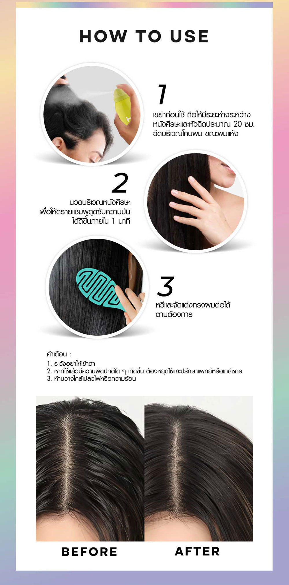 • เขย่าก่อนใช้ ถือให้มีระยะห่างระหว่างหนังศีรษะและหัวฉีดประมาณ 20 ซม. ฉีดบริเวณโคนผมขณะผมแห้ง