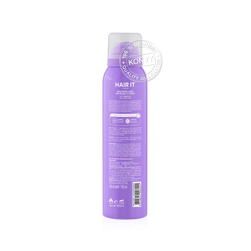 Hair It Restore and Refresh Clean Dry Shampoo 150ml #Floral Gardenia ทางลัดให้เส้นผมและหนังศีรษะพลิ้วสวยเป็นธรรมชาติ ด้วยนวัตกรรมสเปรย์แชมพูแห้งไม่ต้องล้างออก หมดปัญหาผมมันและลีบแบน เพิ่มวอลลุ่มให้ผมพองสวยได้ง่ายๆ ด้วยสารสกัดจาก แครนเบอร์รี อุดมไปด้วยสารแอนตี้ออกซิแดนท์ที่มีวิตามินซีสูง ช่วยสร้างคอลลาเจน ให้เส้นผมแข็งแรง ลดการหลุดร่วงง่าย และวิตามินบี 5 เติมเต็มความชุ่มชื้นเส้นผมนุ่มลื่น เงางาม เสริมสร้างเส้นผมและหนังศีรษะสุขภาพดียิ่งขึ้น เผยผมพองสวยมีวอลลุ่ม เพิ่มความสดชื่นให้กับเส้นผมด้วยกลิ่นหอมเป็นเอกลักษณ์ เหมือนสระผมใหม่ทุกครั้งที่ใช้
